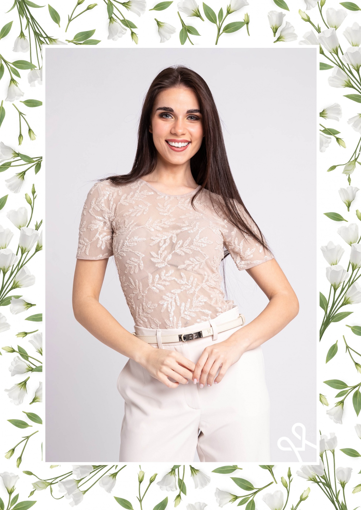 Szűkebb fazonú, alakot követő női felső flitteres-tüll anyagból, kerekített, mélyebb kivágással és rövid ujjal, amely elegáns és különleges tavaszi megjelenést biztosít.