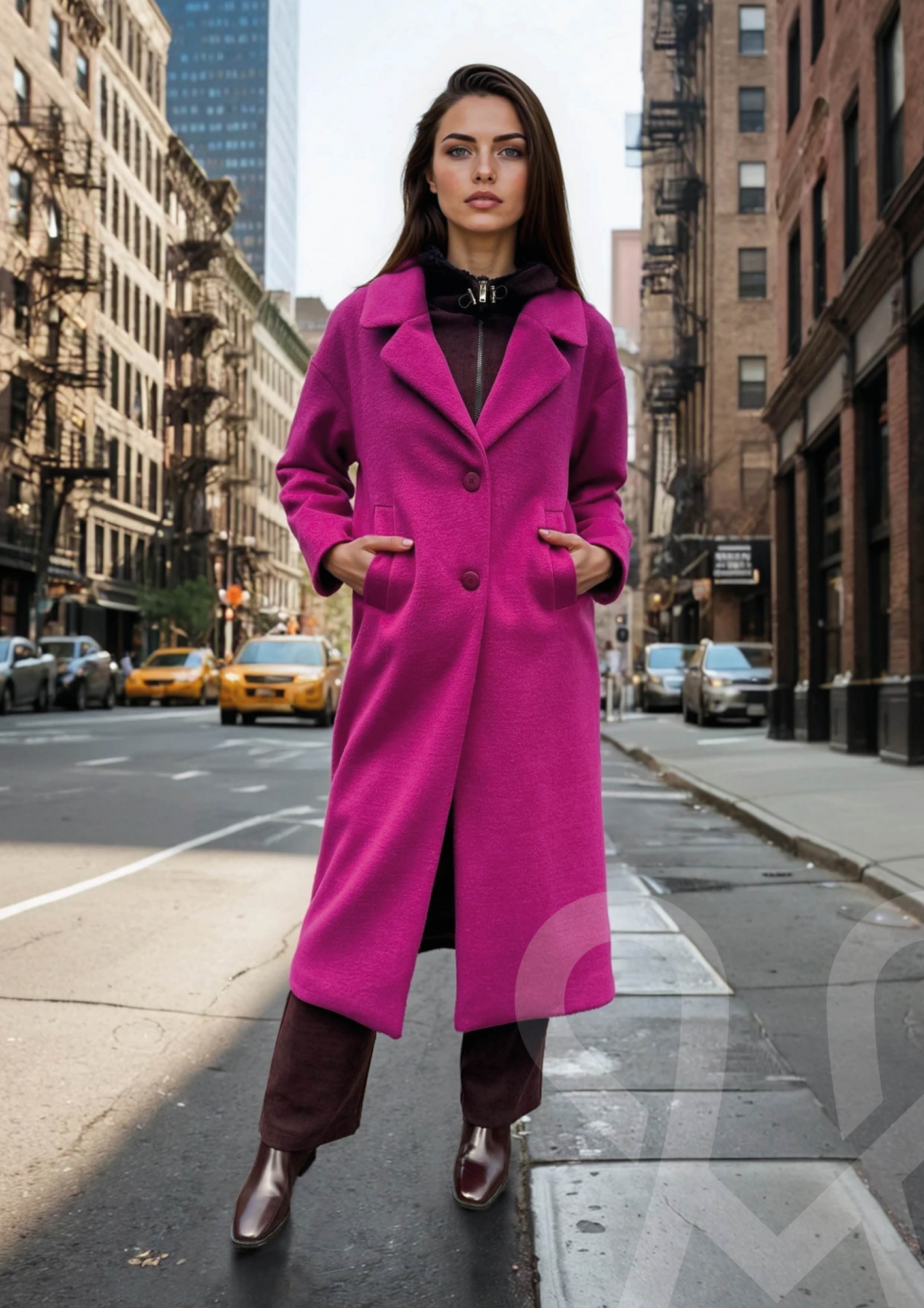 Bővebb fazonú, térdig érő fuxia szövetkabát széles kihajtós gallérral és praktikus zsebekkel, mely elegáns megjelenést és kényelmes viseletet biztosít a hűvösebb napokon.