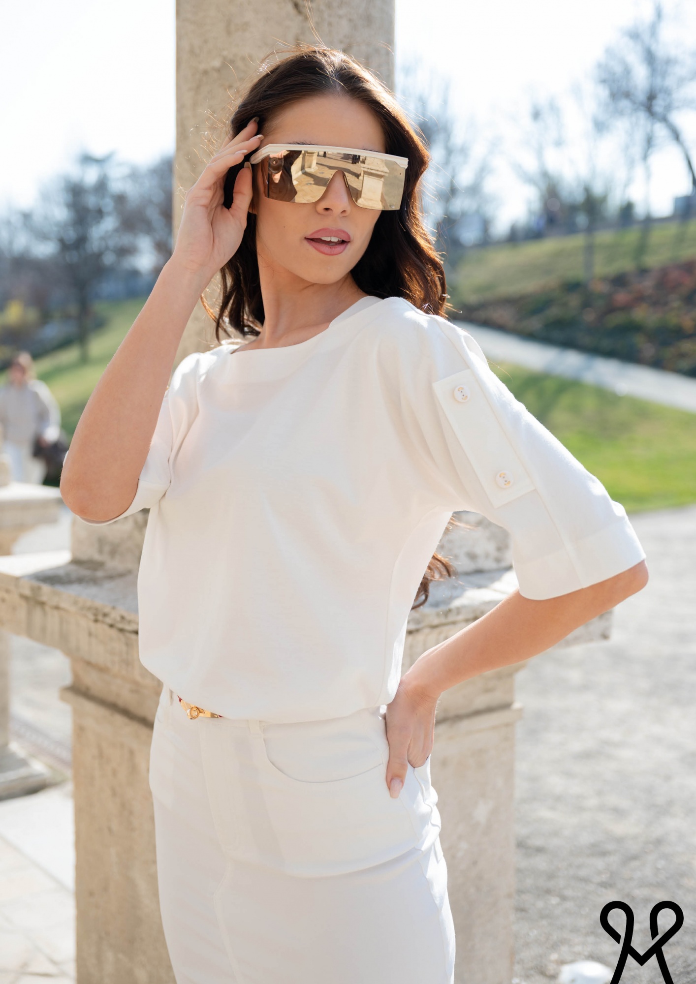 Laza fazonú, vaj színű puntó felső 3/4-es ujjhosszal és oldalán gombos díszítéssel, a nyári kollekció kényelmes és nőies darabja.