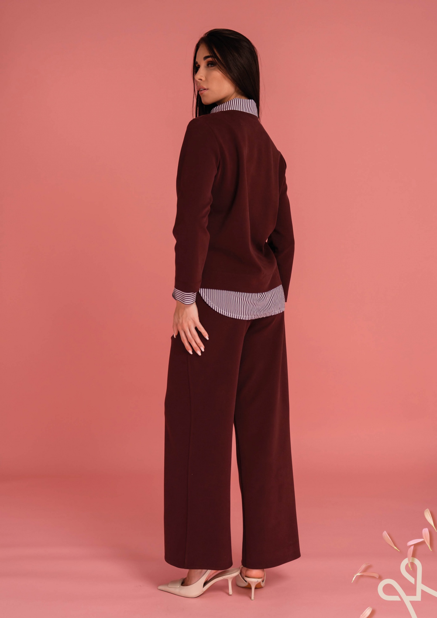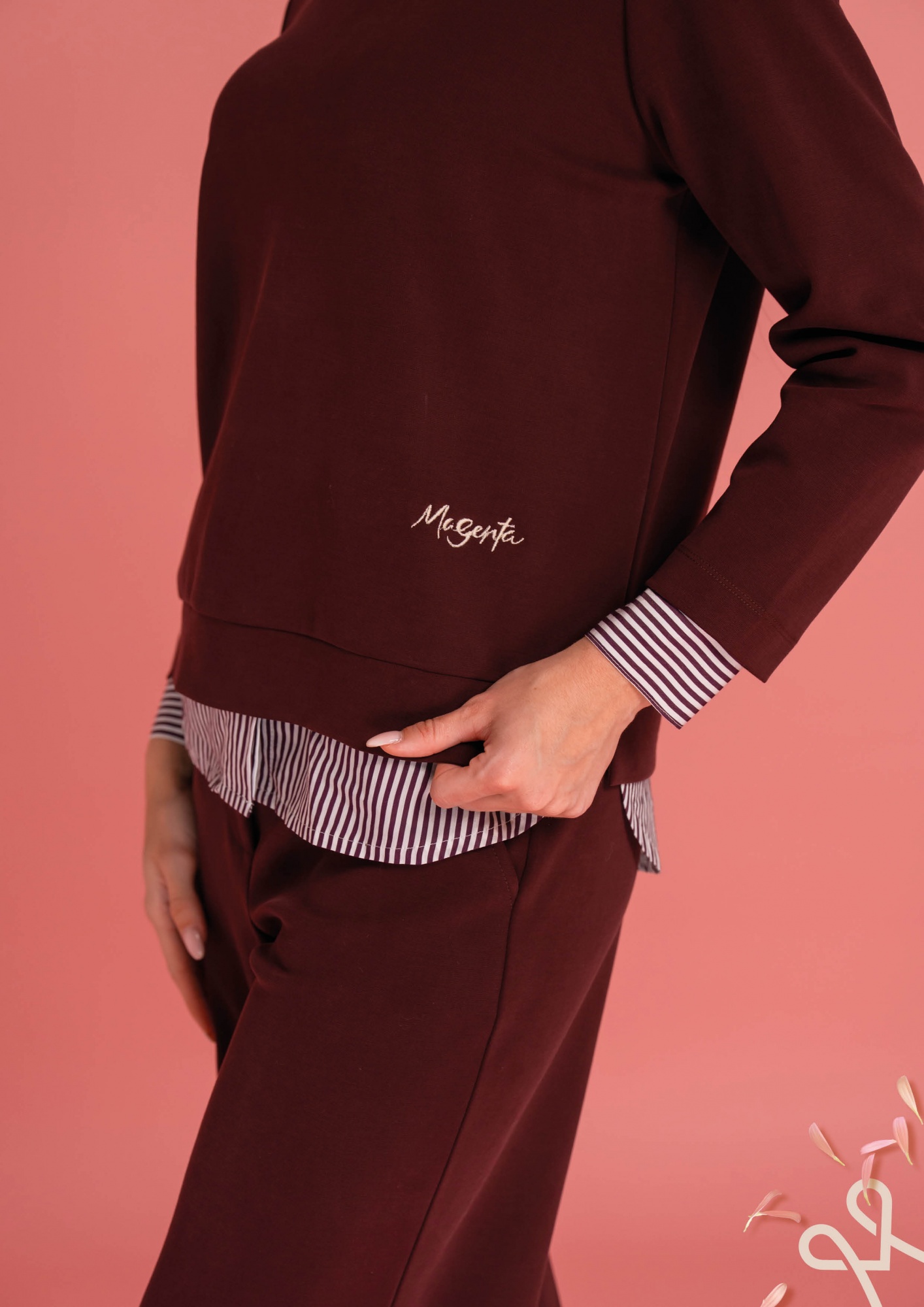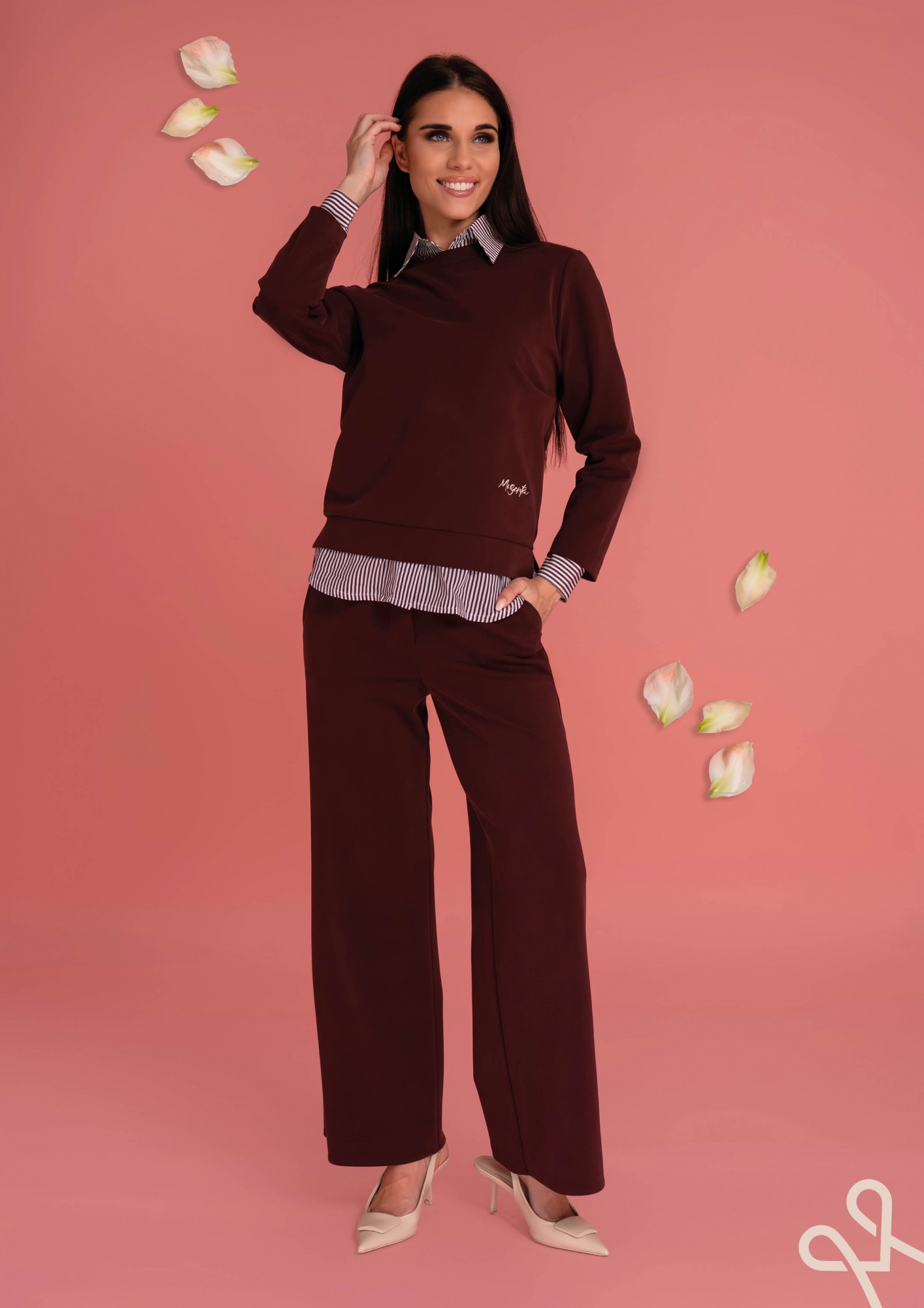 Bordó színű, lazább, bővebb fazonú női pulóver kerek nyakkivágással és oldalán hímzéssel, amely kényelmes és stílusos tavaszi viseletet biztosít.