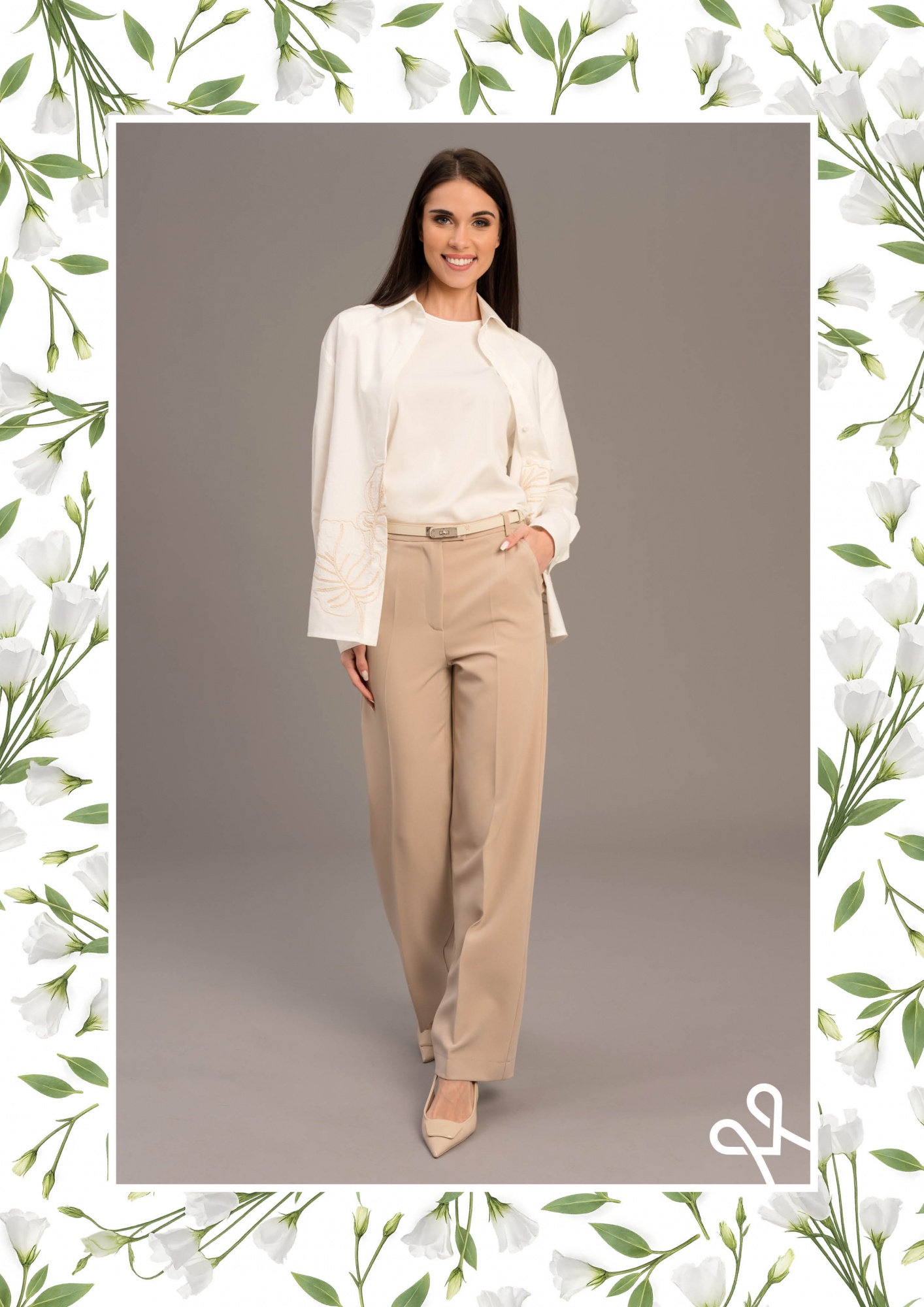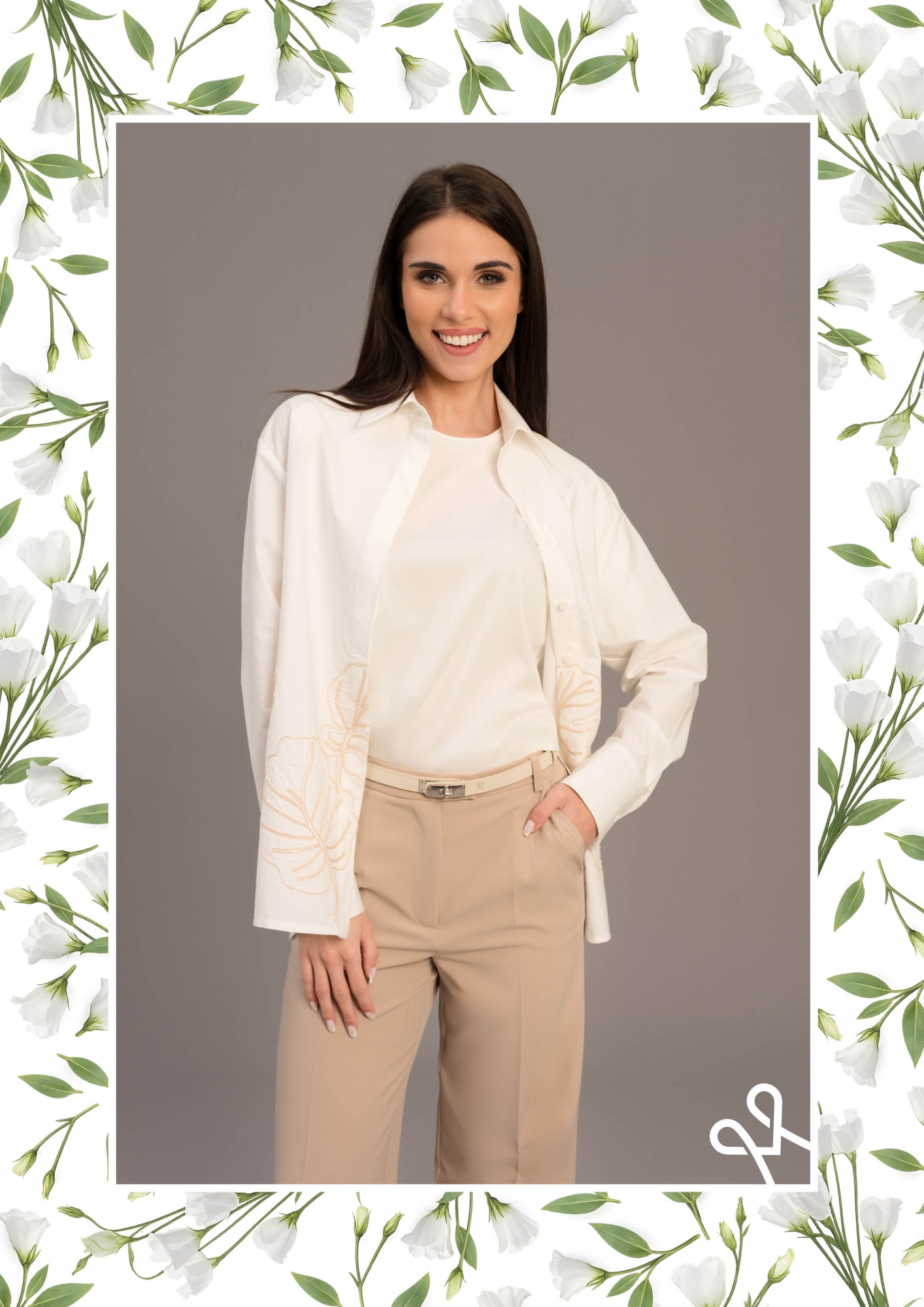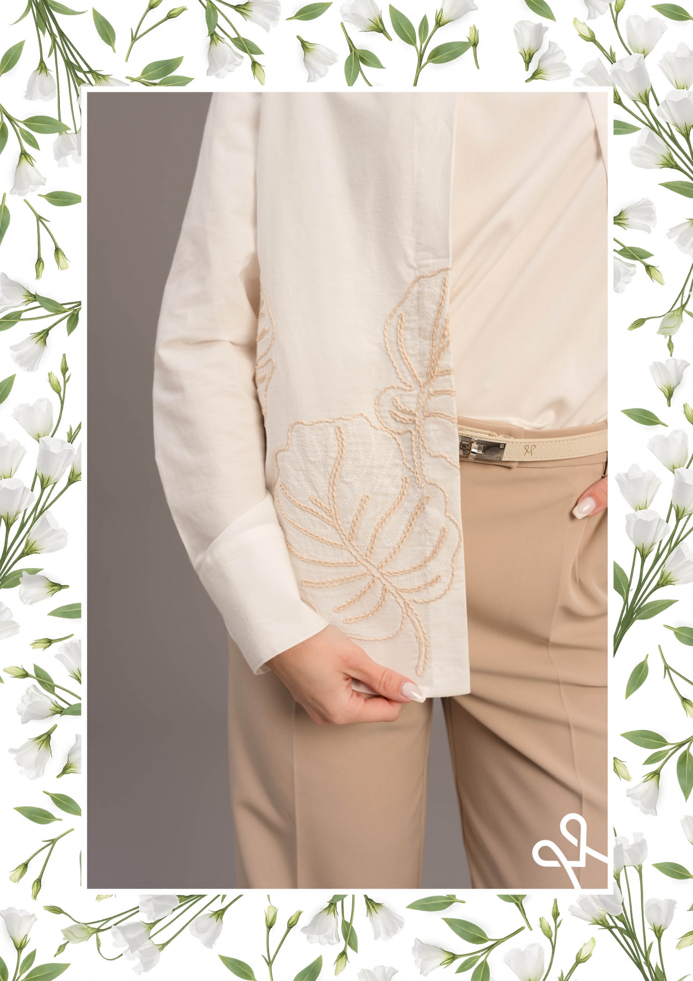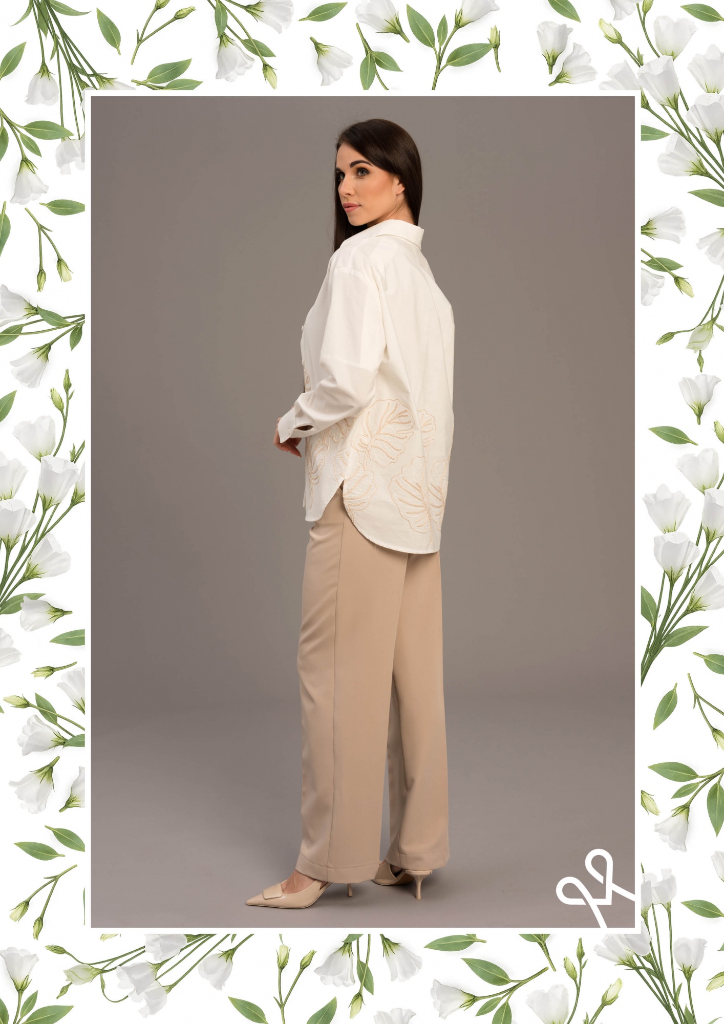 Laza, bővebb szabású vászon ing elöl gombos záródással, bordűrös díszítéssel és finoman hímzett anyagból a természetes eleganciáért.