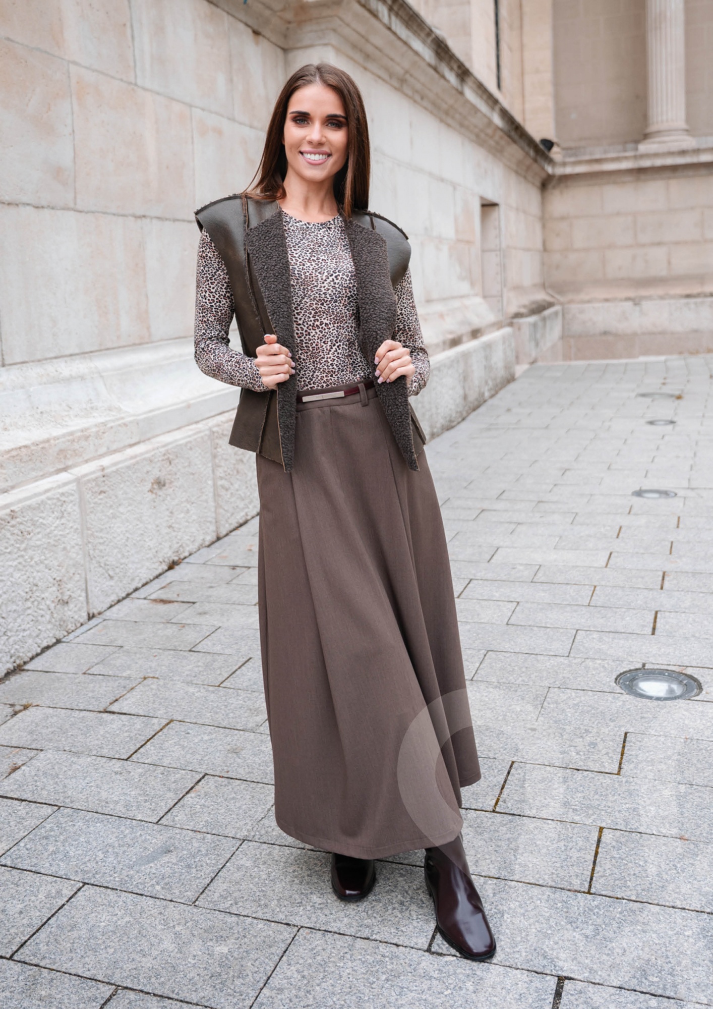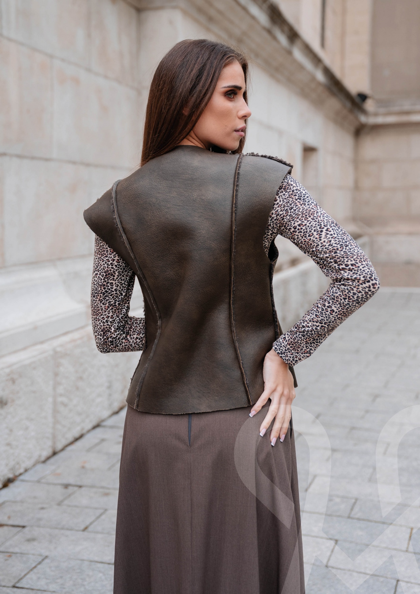 Rövidebb fazonú, bővebb szabású műirha mellény, melyet az átlapolt szabásvonalak tesznek stílusossá és modern, kifinomult megjelenésűvé.