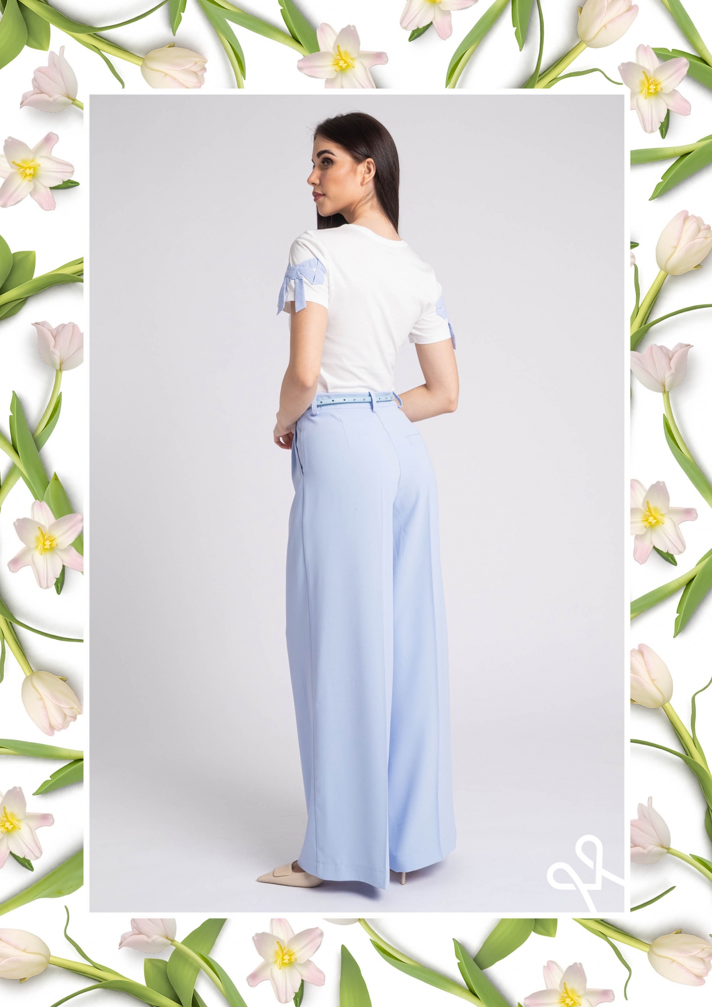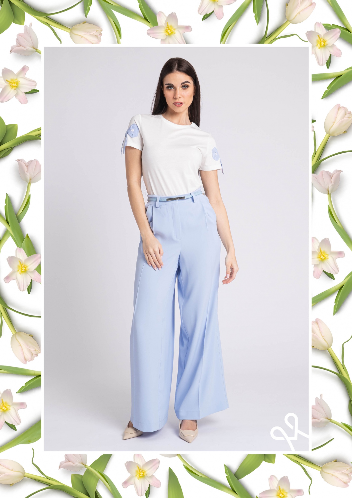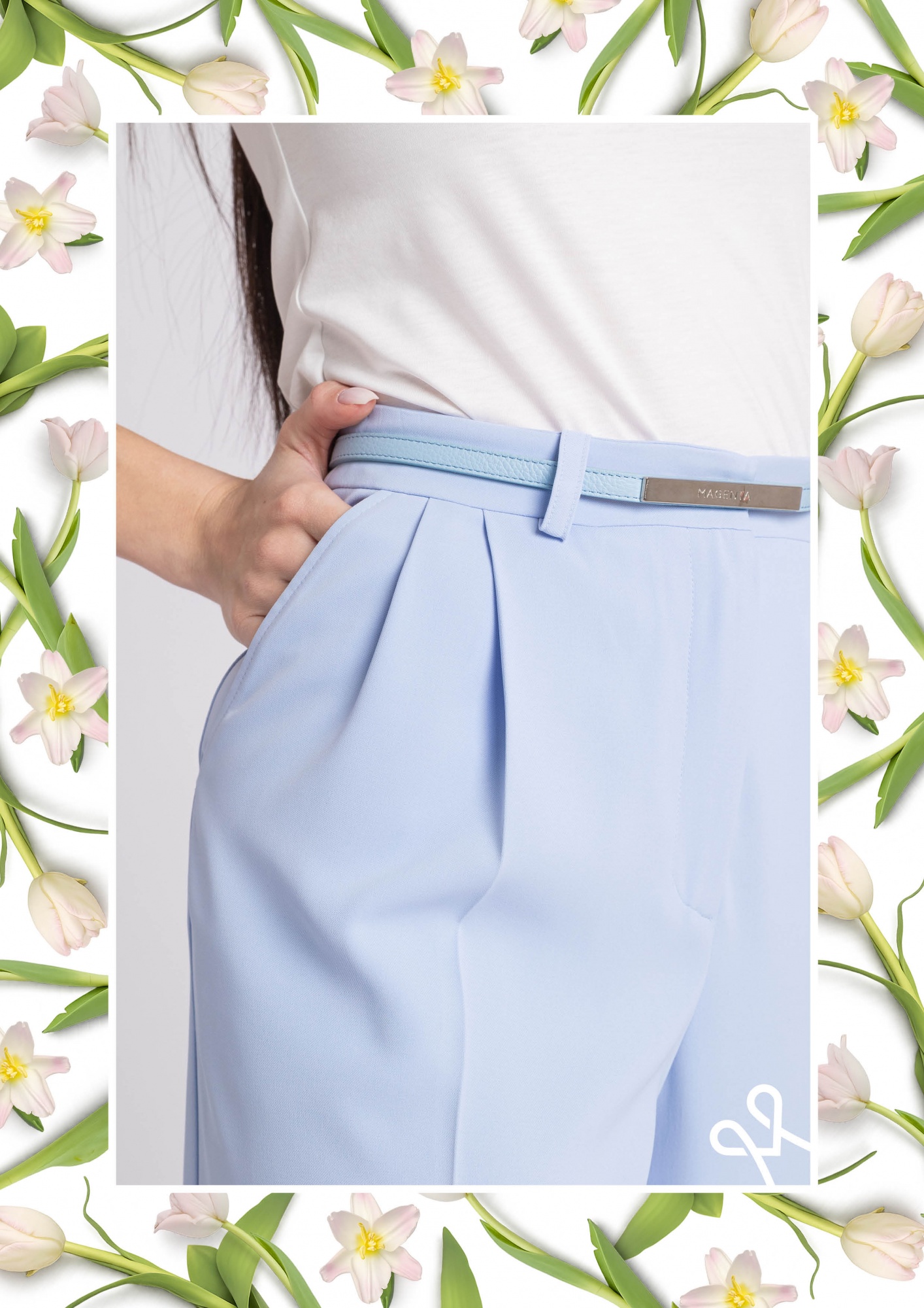 Bő szárú, kék kevert szálas nadrág hajtásokkal és svédzsebekkel, kapcsos-cipzáras záródással és övbújtatóval a nyári, laza stílusért.