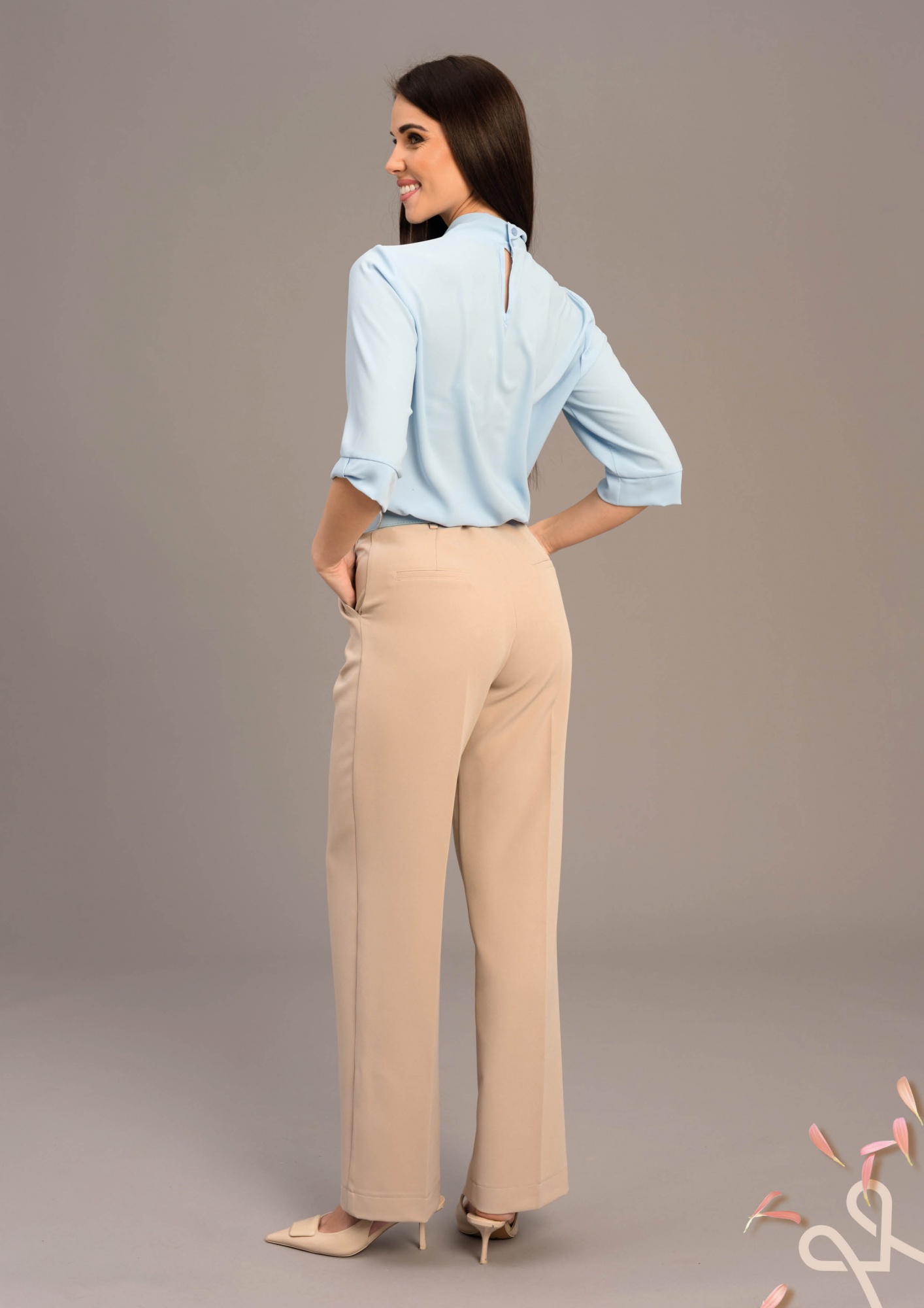 Elegáns, lazább fazonú kék női blúz V-kivágással és hajtott részletekkel, hátul gombos záródással.