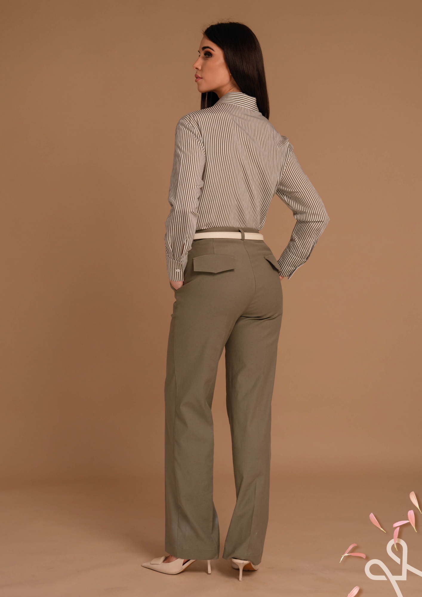 Csíkos, lazább, bővebb fazonú női vászon ing elején gombos záródással, gallérral és széles, gombolható mandzsettával, amely könnyed és stílusos tavaszi viselet.