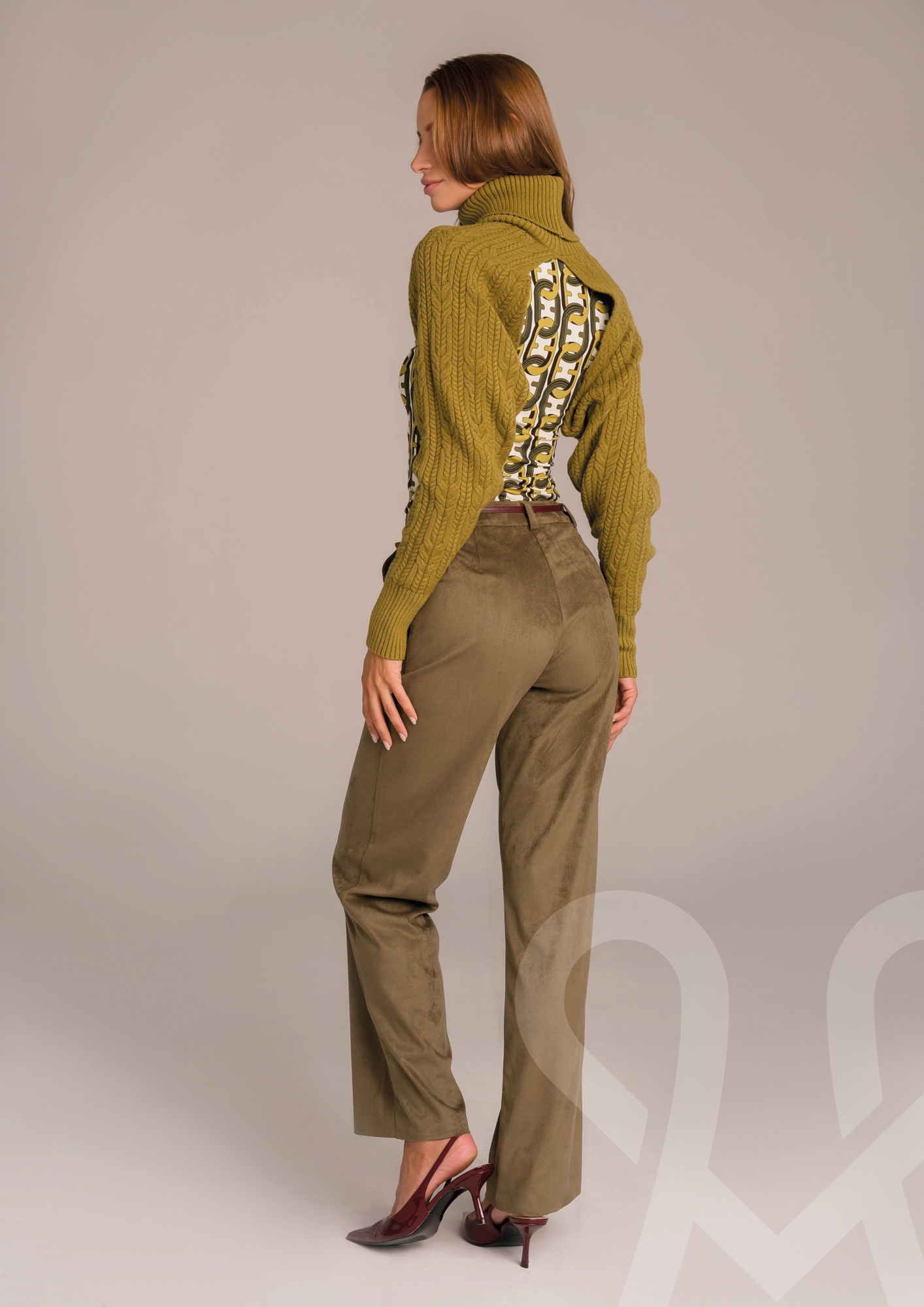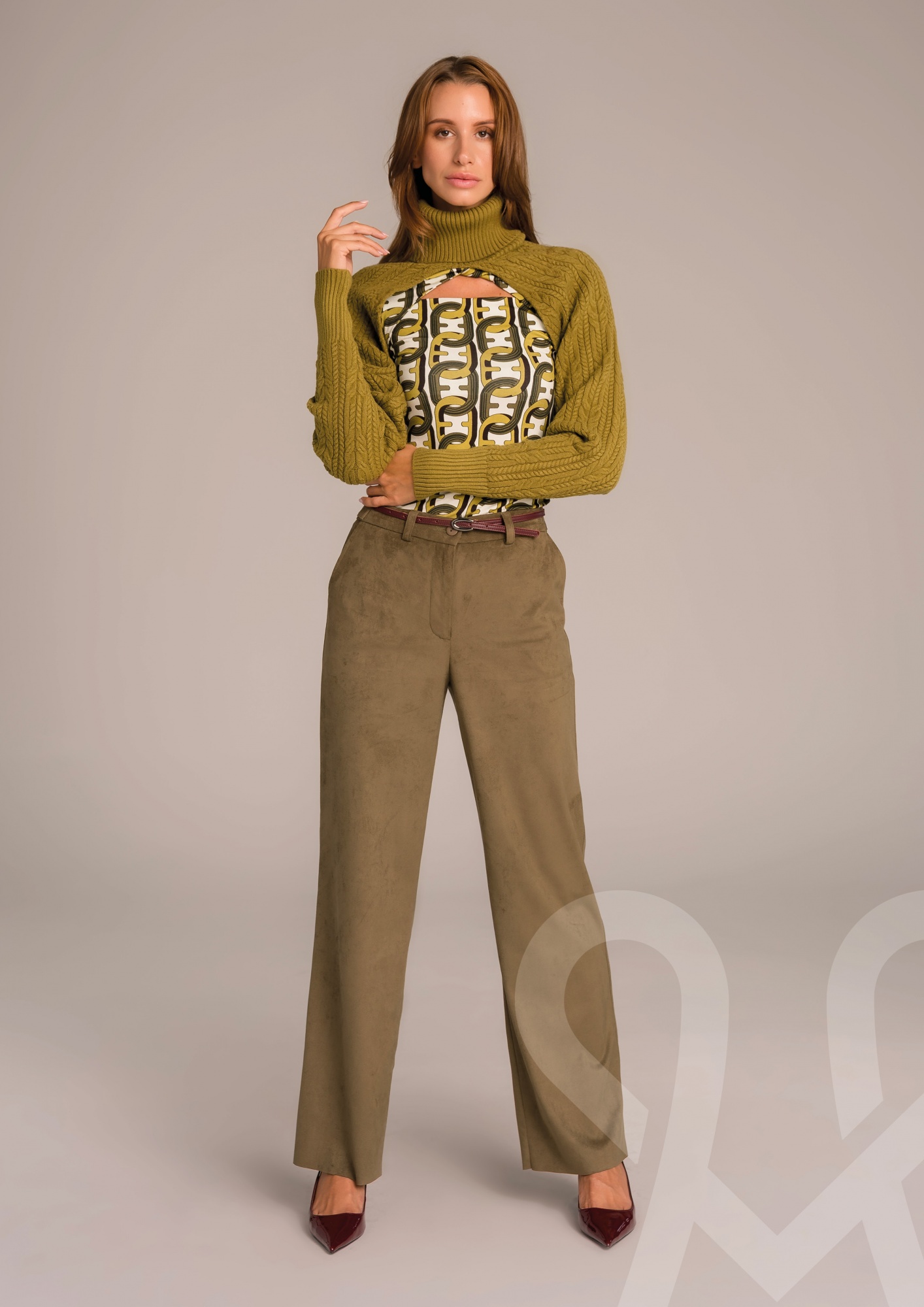 Enyhén elasztikus velúr anyagból készült, bő szabásvonalú, kahki színű Magenta nadrág, állítható derékrésszel.