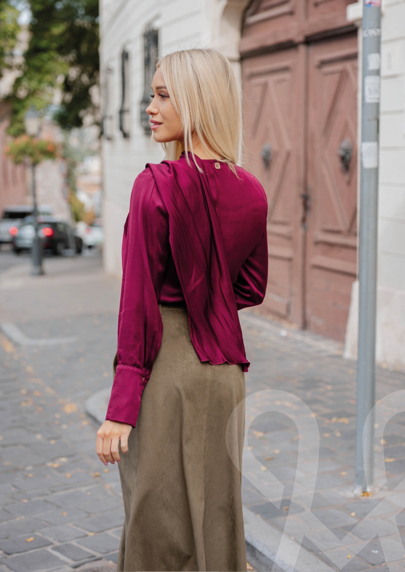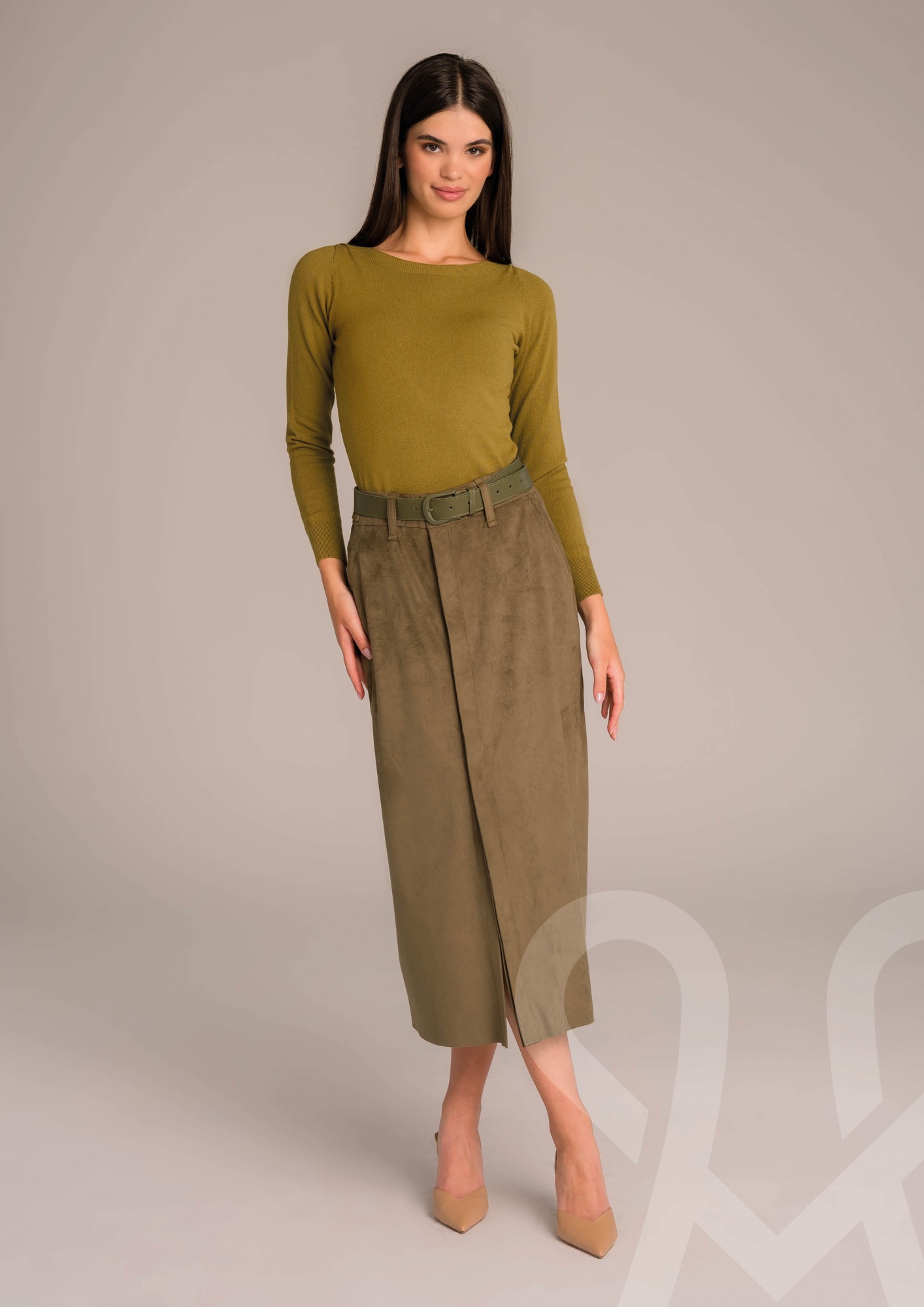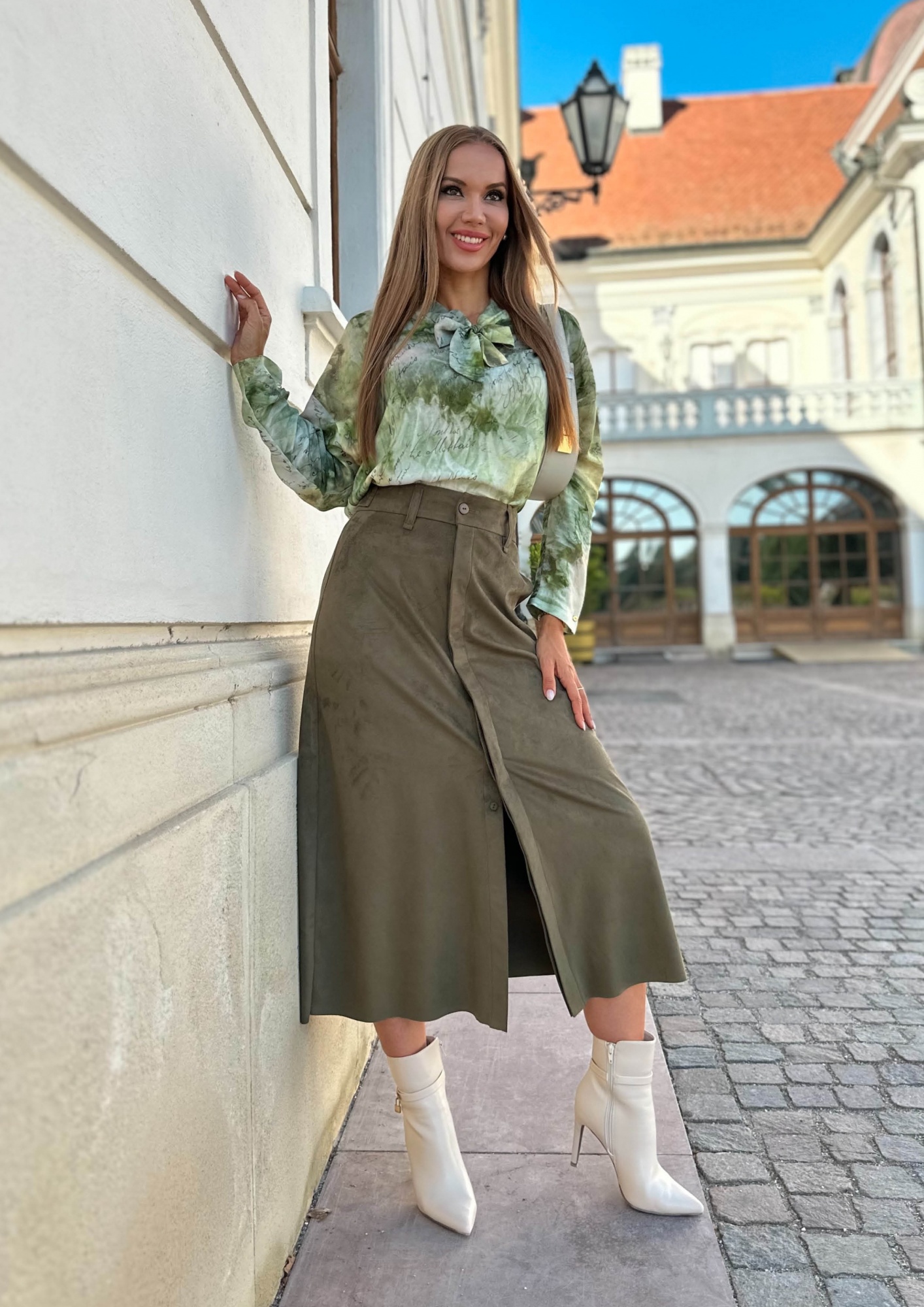 Ez az egyenes fazonú, khaki zöld színű velúr szoknya letisztult, mégis karakteres darab, amely stílusosan kiemeli az alakot. Elöl elhelyezett diszkrét hasítéka nőies lendületet ad a szabásnak, a gombos záródás pedig klasszikus, mégis modern megjelenést biztosít. Az övbújtatók lehetőséget adnak egyéni kiegészítők, például egy hangsúlyos öv viselésére, amely tovább fokozza a szoknya személyre szabhatóságát. Őszi és téli outfitek tökéletes alapdarabja lehet, bokacsizmával és kötött felsővel párosítva pedig igazán trendi megjelenést nyújt.