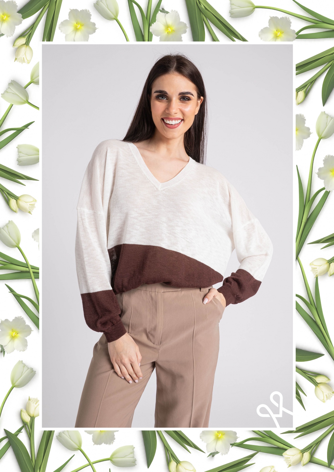 Vaj színű, vékony kötésű Magenta felső, laza fazonú, elején V-nyakkivágással, ejtett vállrésszel, hosszú ujjakkal. Oldalán rávarrt textil Magenta márkajelzés. A felső egyméret méretben készült.