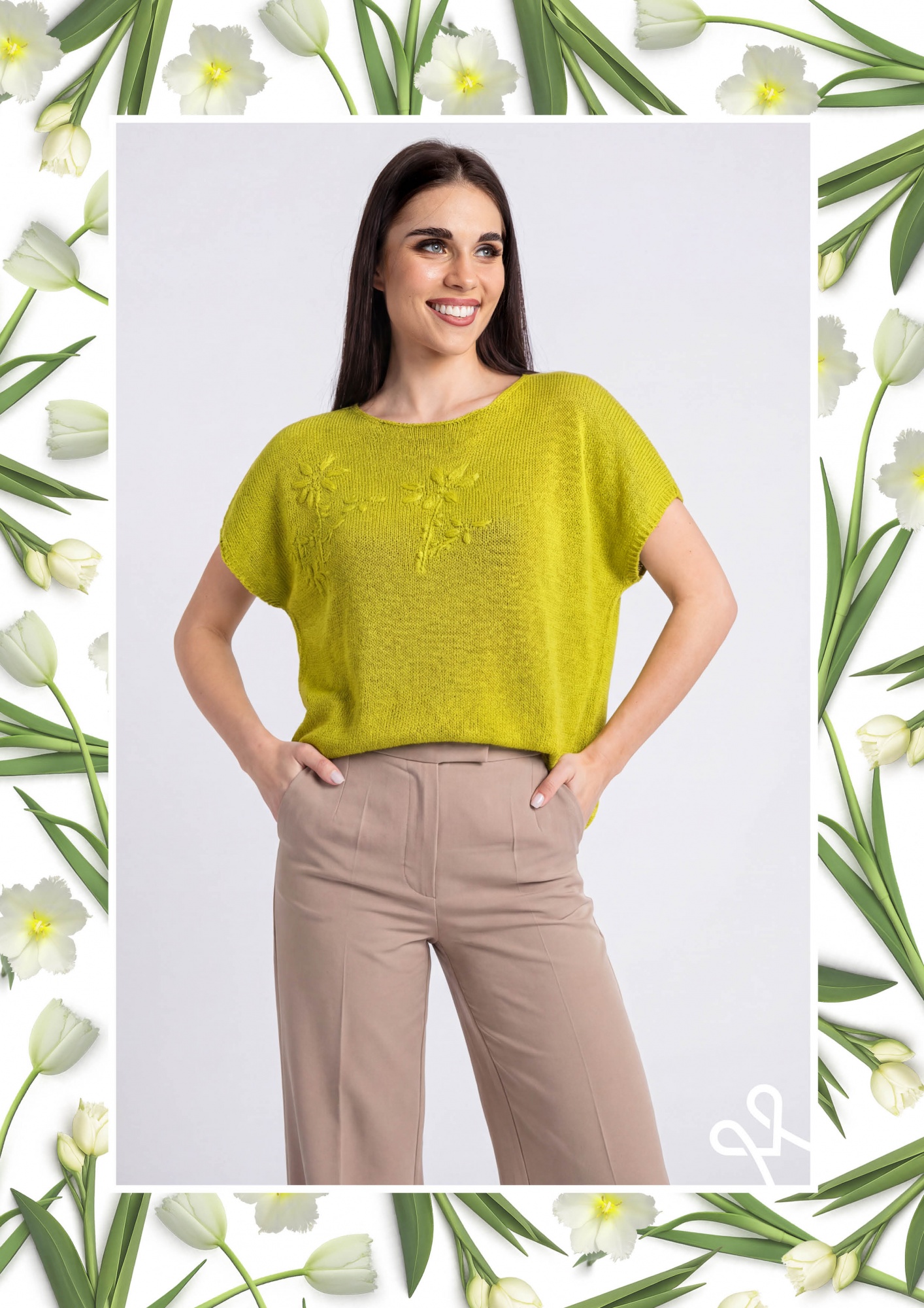 Elasztikus anyagból készült, laza szabásvonalú, lime színű felső, elején mintával díszítve.