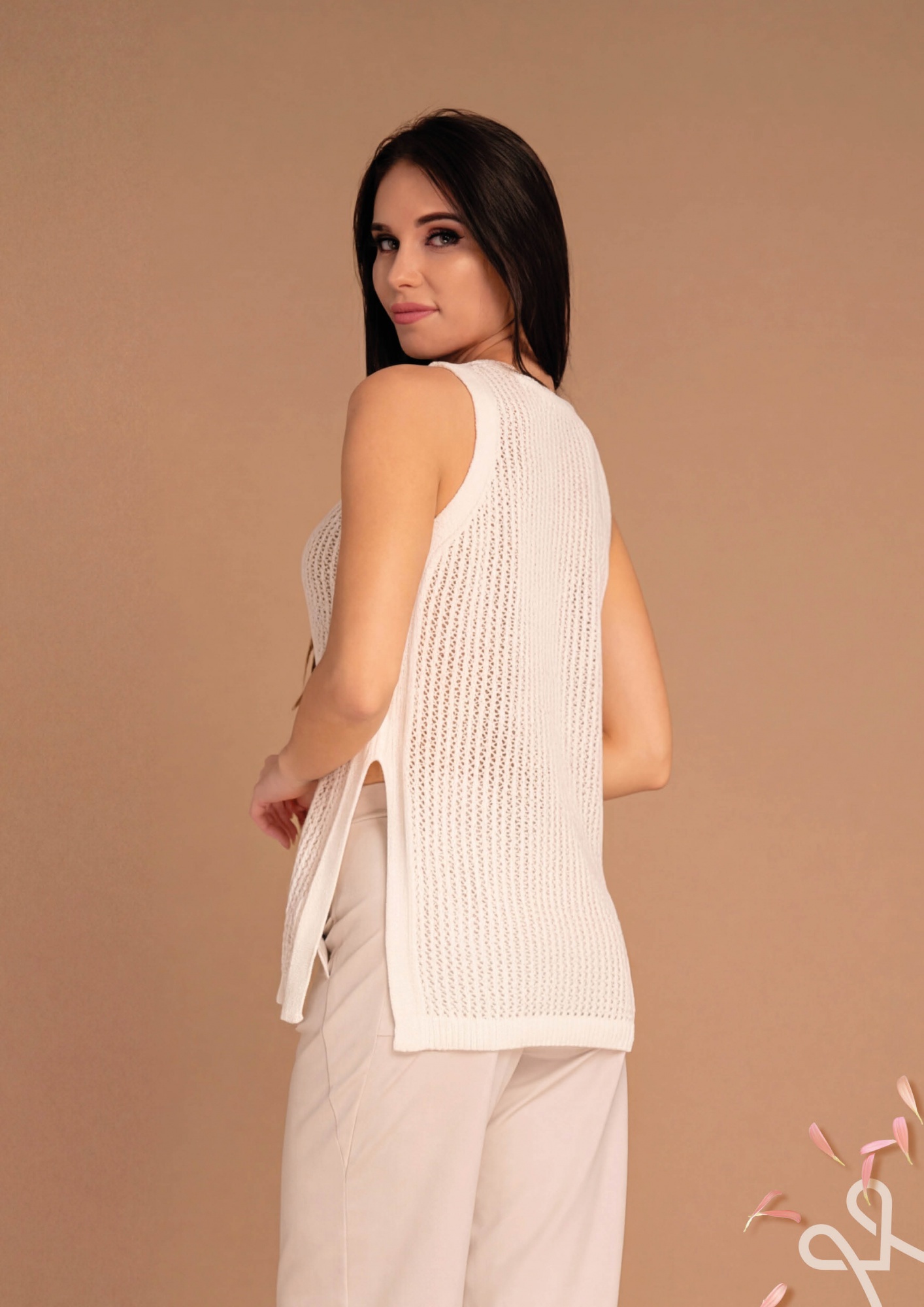 Fehér színű , laza fazonú, ritkább kötésű ujjatlan felső kerek nyakkal és oldalán sliccel, amely könnyed, stílusos tavaszi megjelenést biztosít.