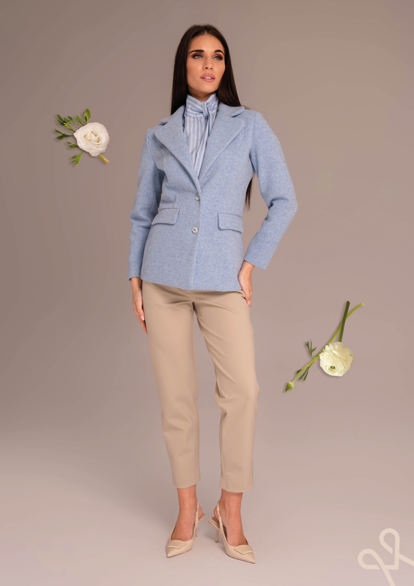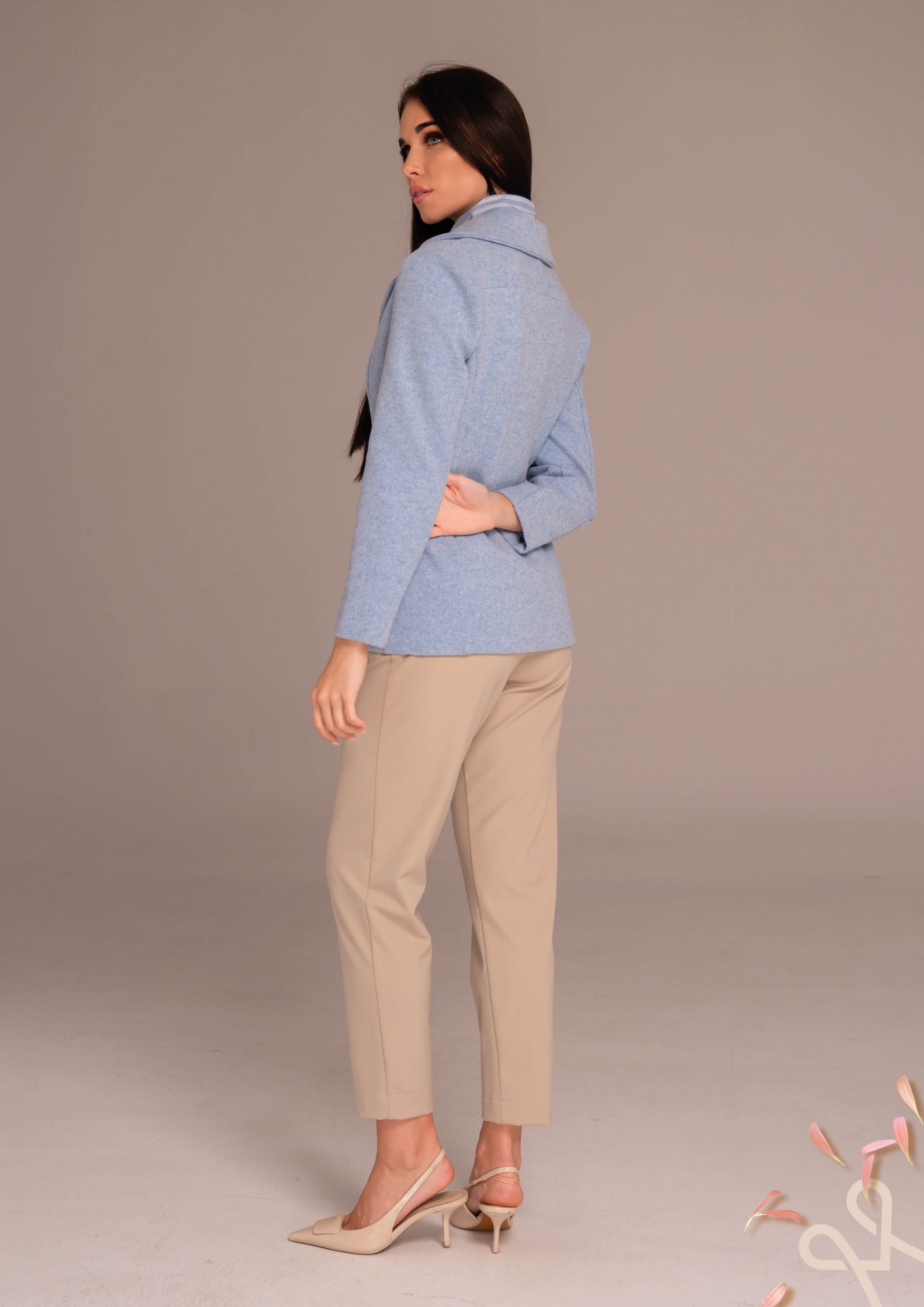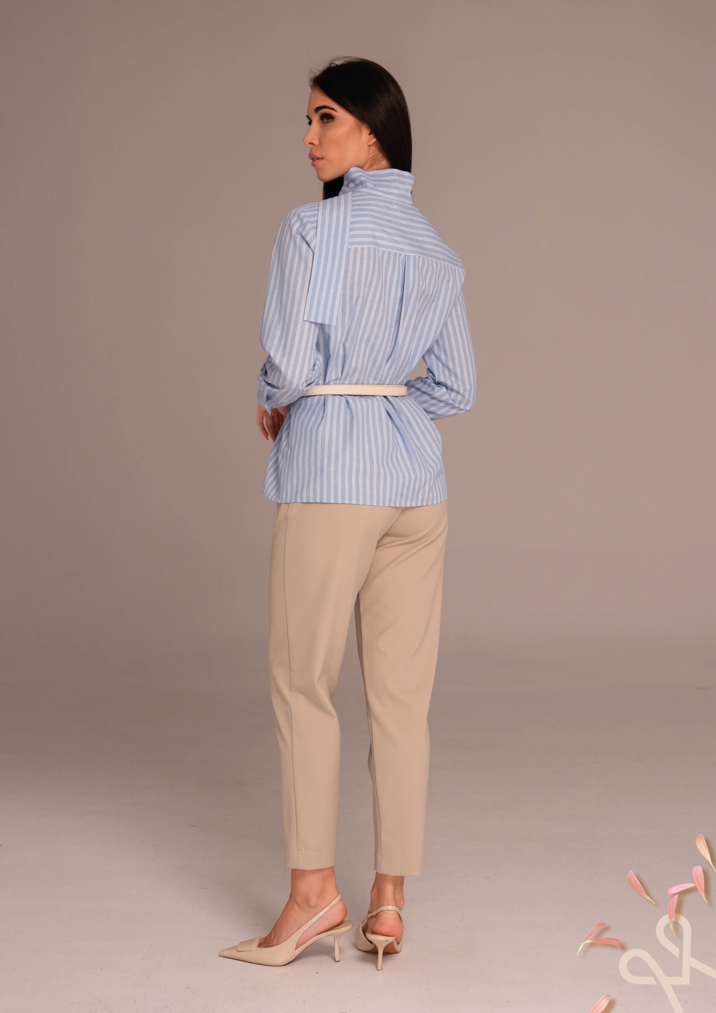 Krém színű, szűkülő szárú női pamut vászon nadrág enyhén elasztikus anyagból, elején gombos és cipzáras záródással, oldalzsebekkel, amely kényelmes és elegáns tavaszi viselet.
