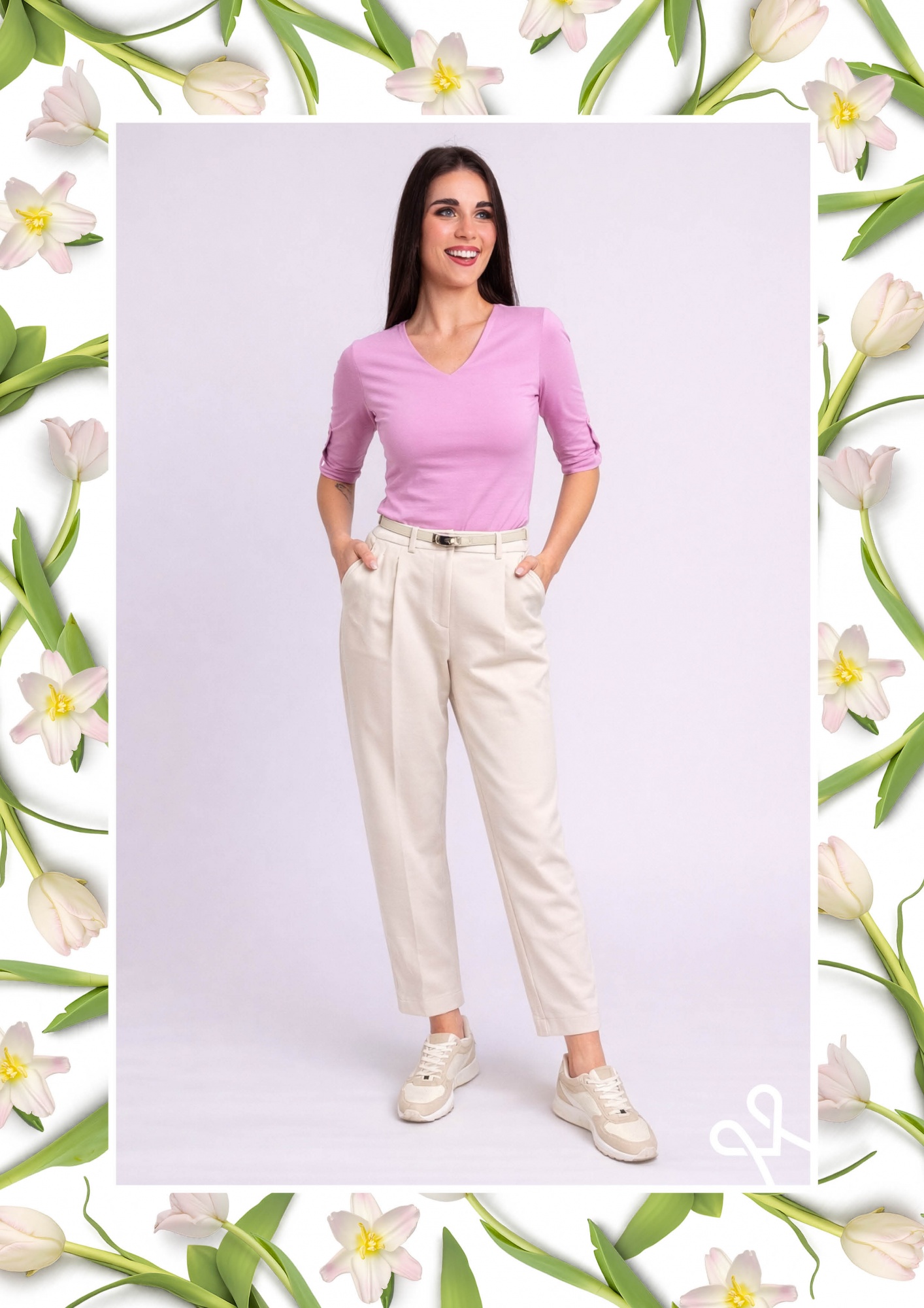 Bézs színű, alul szűkülő, elasztikus női nadrág gumis derékrésszel és oldalzsebekkel, amely kényelmes és sportos tavaszi viseletet biztosít.