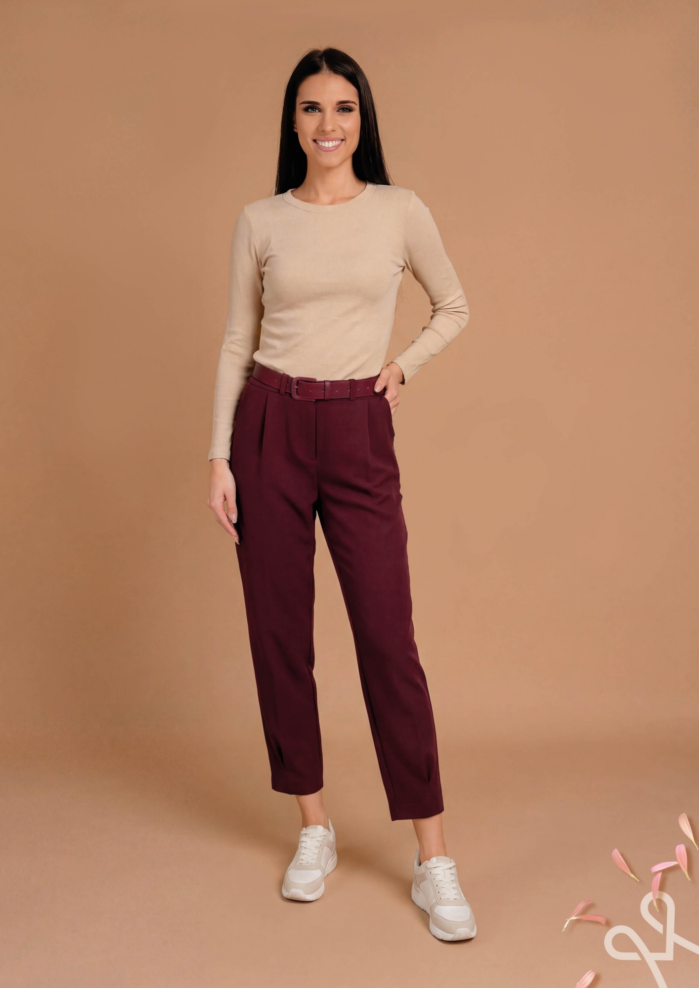 Bordó színű, alul szűkülő, elasztikus női nadrág gumis derékrésszel és oldalzsebekkel, amely kényelmes és sportos tavaszi viseletet biztosít.