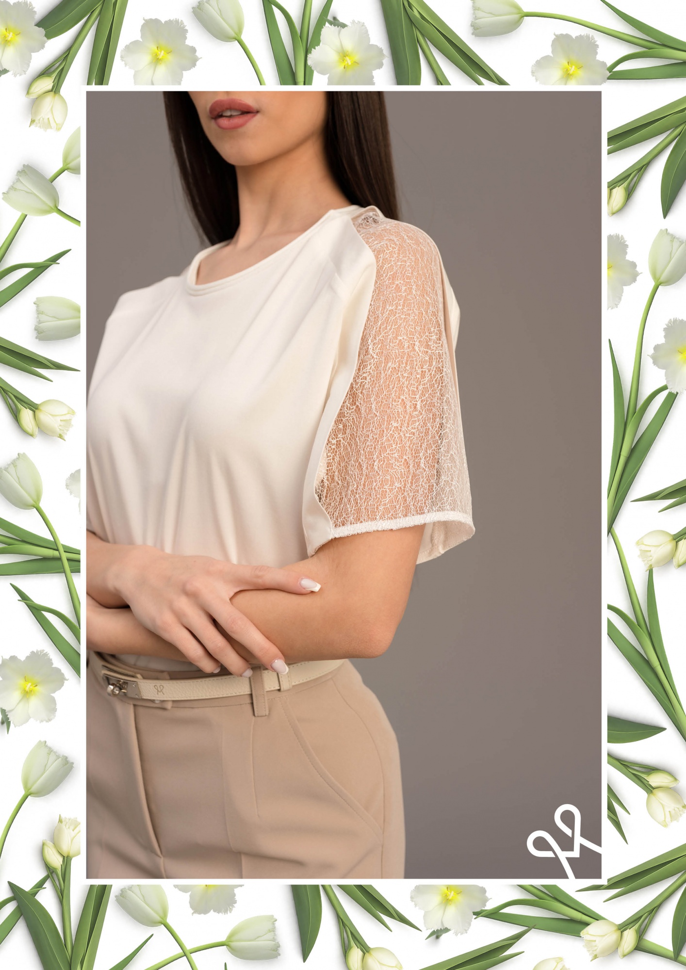 Bővebb fazonú, laza esésű felső elasztikus viszkózból, áttetsző vállrészletekkel, kerek nyakkivágással és 3/4-es ujjhosszal a kényelmes eleganciáért.