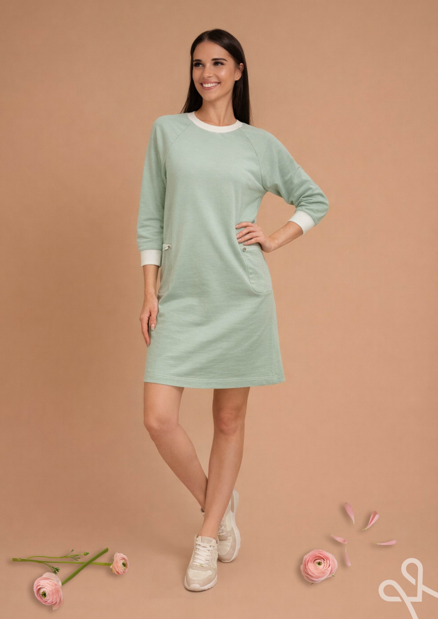 Zöld színű, laza fazonú, vékony punto anyagú női ruha oldalán zsebbel, nyakán és ujjain passzéval díszítve, amely kényelmes és stílusos tavaszi viseletet biztosít.