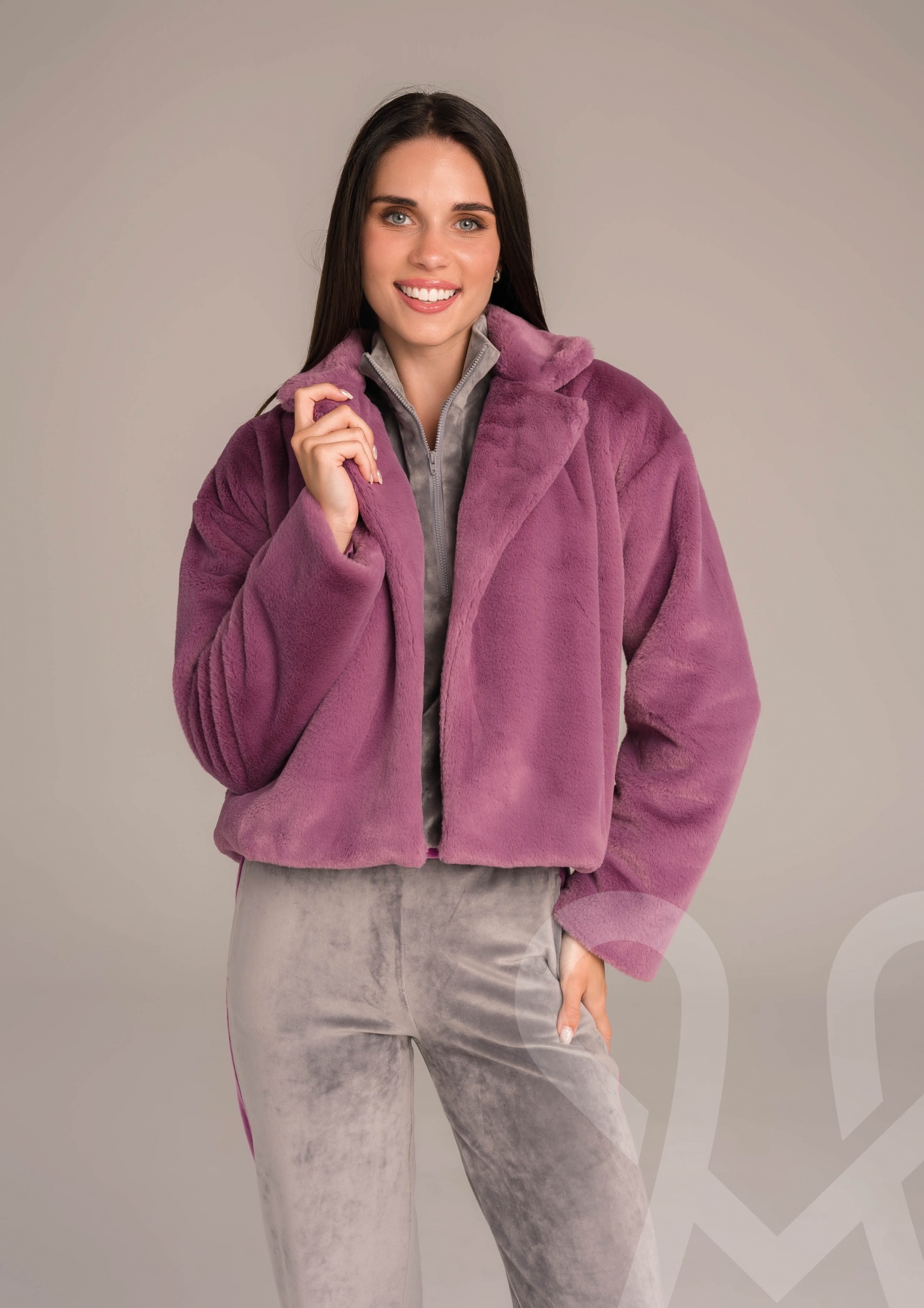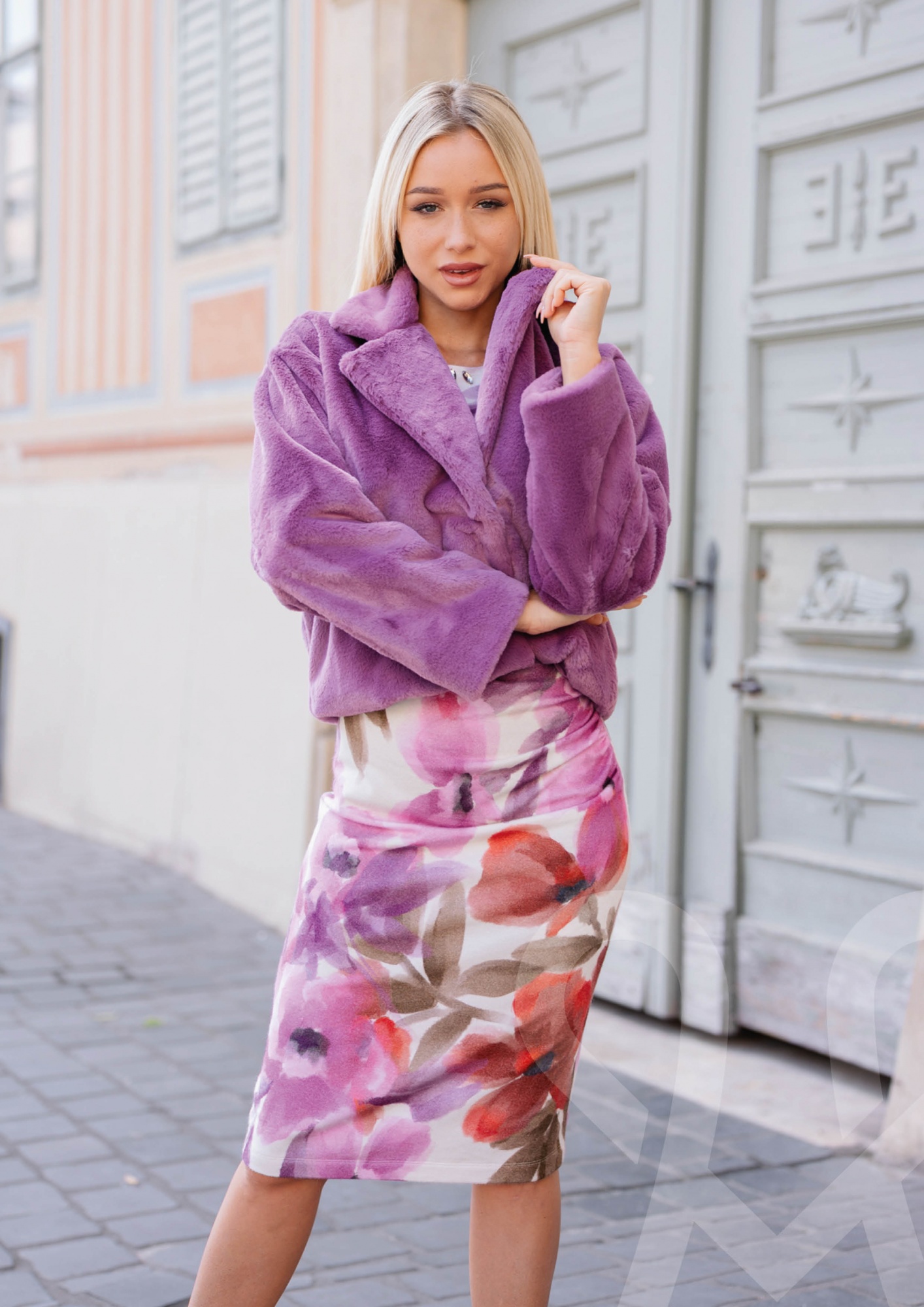 Bővebb szabású, rövid lila Magenta műszőrme bunda, amelyet oldalán praktikus zseb és elegáns, széles kihajtós gallér tesz igazán különlegessé.