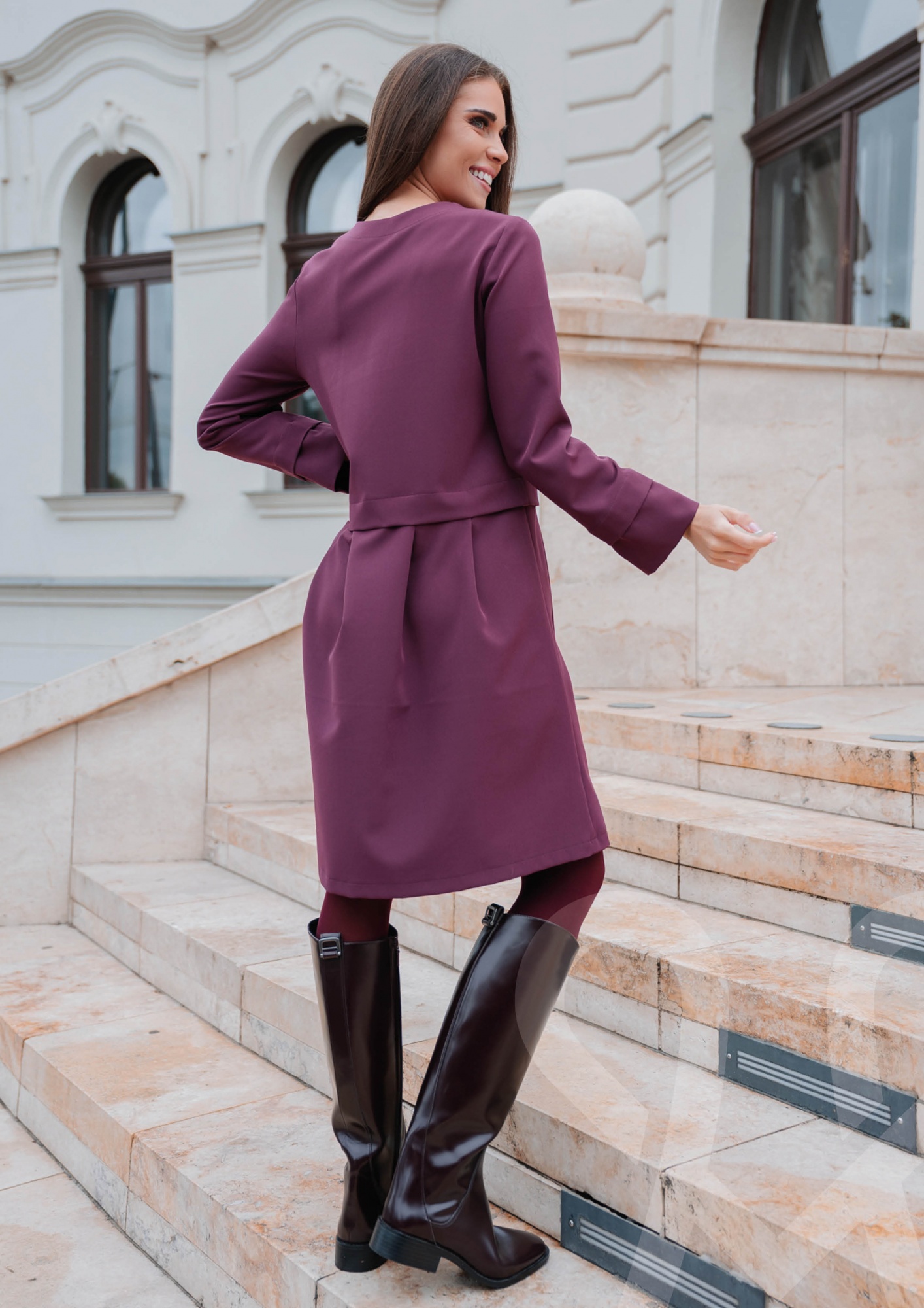 Kifinomult, bővebb fazonú lila ruha kevert szálas anyagból, elöl finom V-kivágással és rakott alsó résszel a légies, nőies megjelenésért.