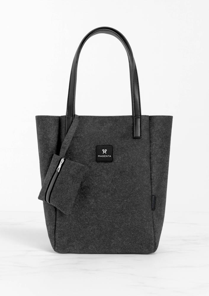 Filc anyagú, szürke színű táska tépőzáras záródással és belső oldalzsebbel, amely praktikus és stílusos kiegészítő mindennapi használatra.