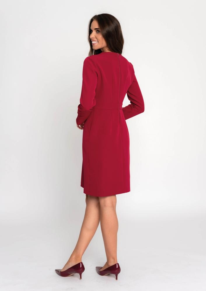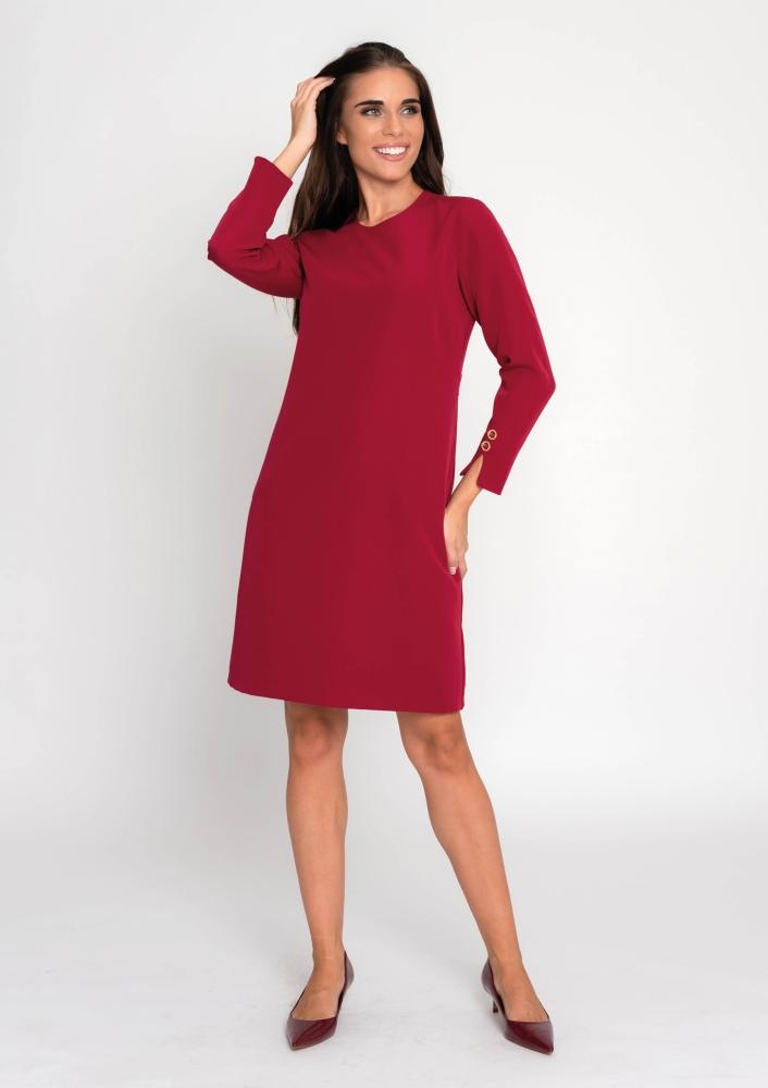 Lazább fazonú, málna színű, térd fölé érő ruha kevert szálas anyagból, kerek nyakkivágással és hátul cipzáros záródással a kényelmes, mégis elegáns megjelenésért.