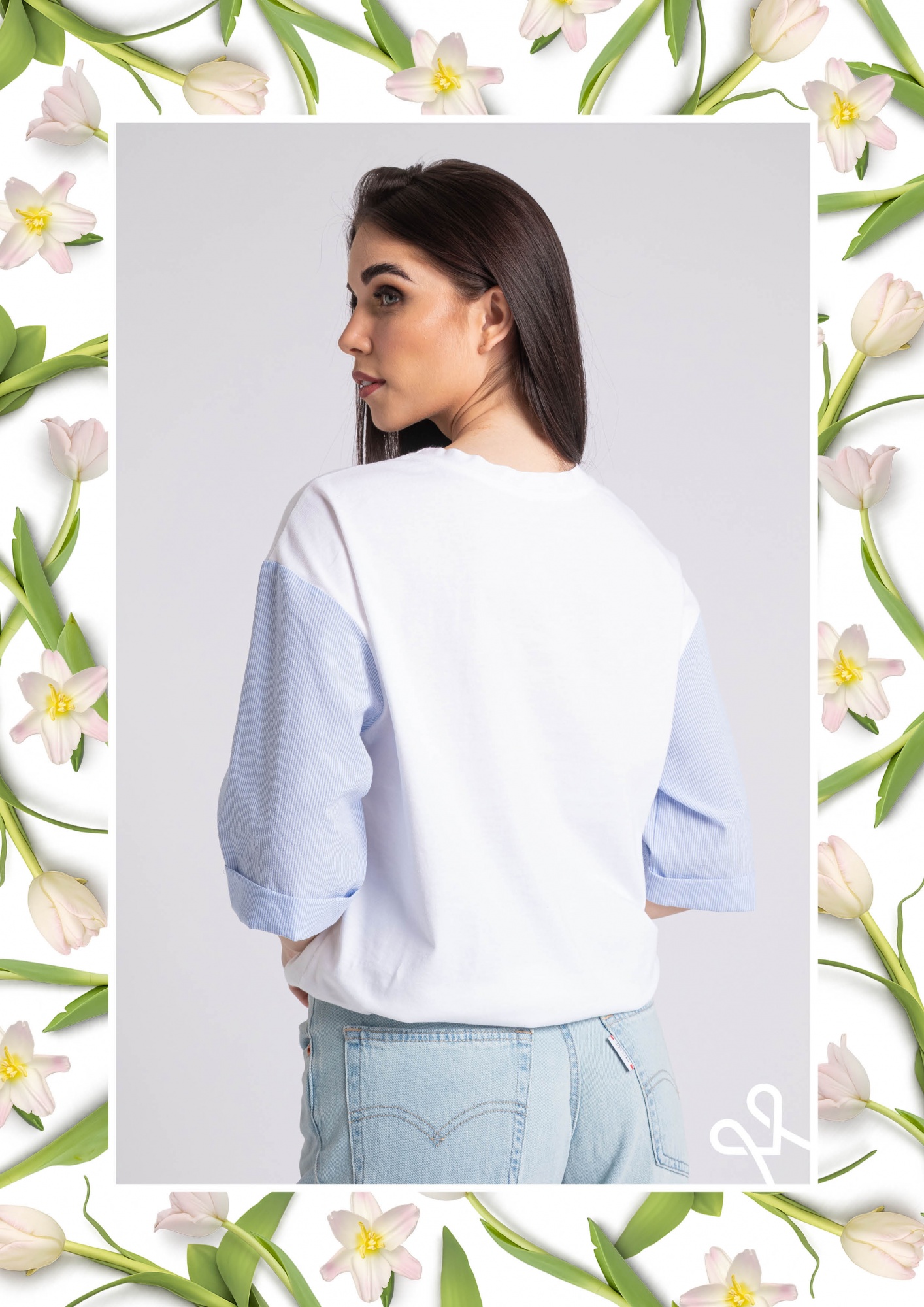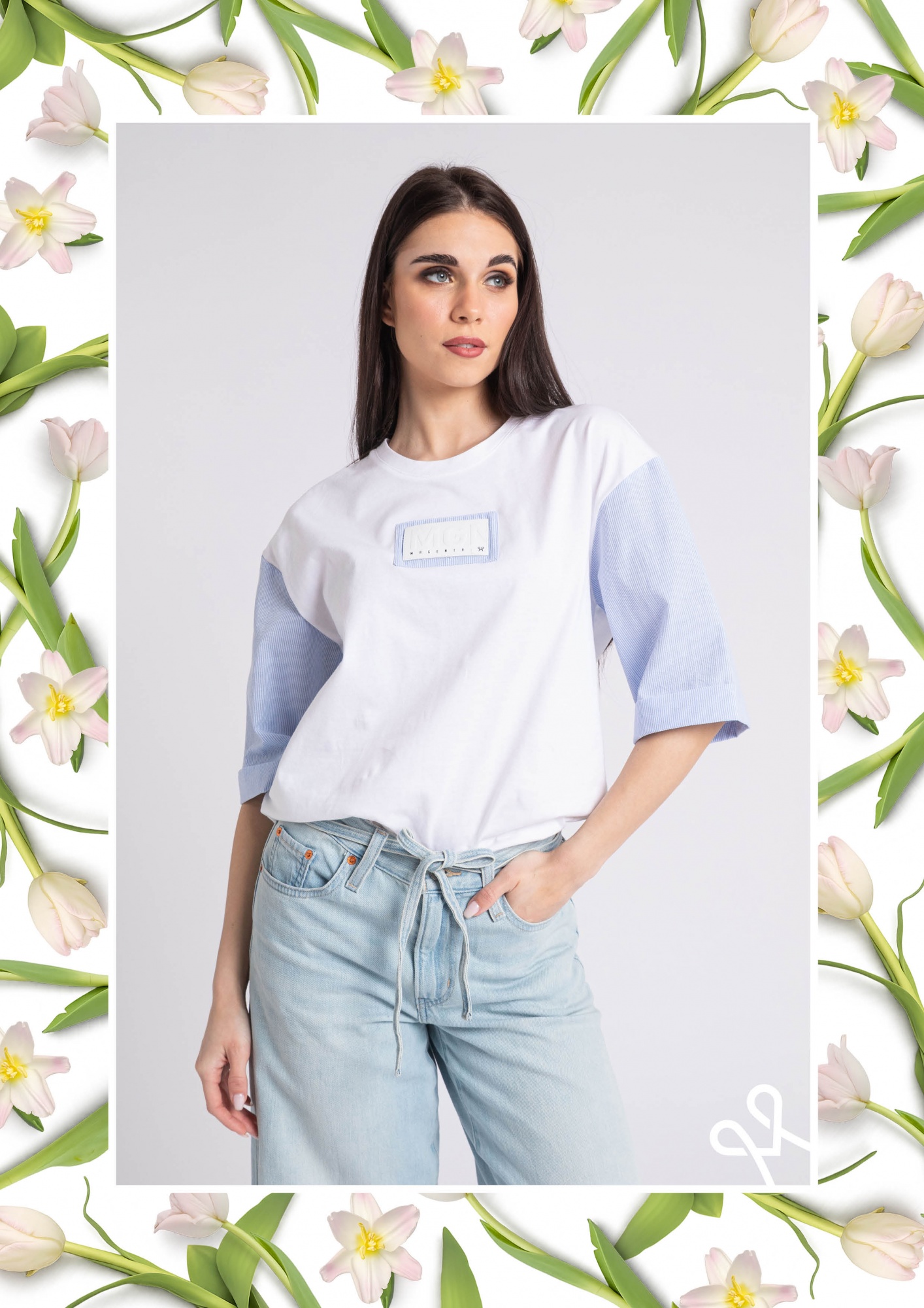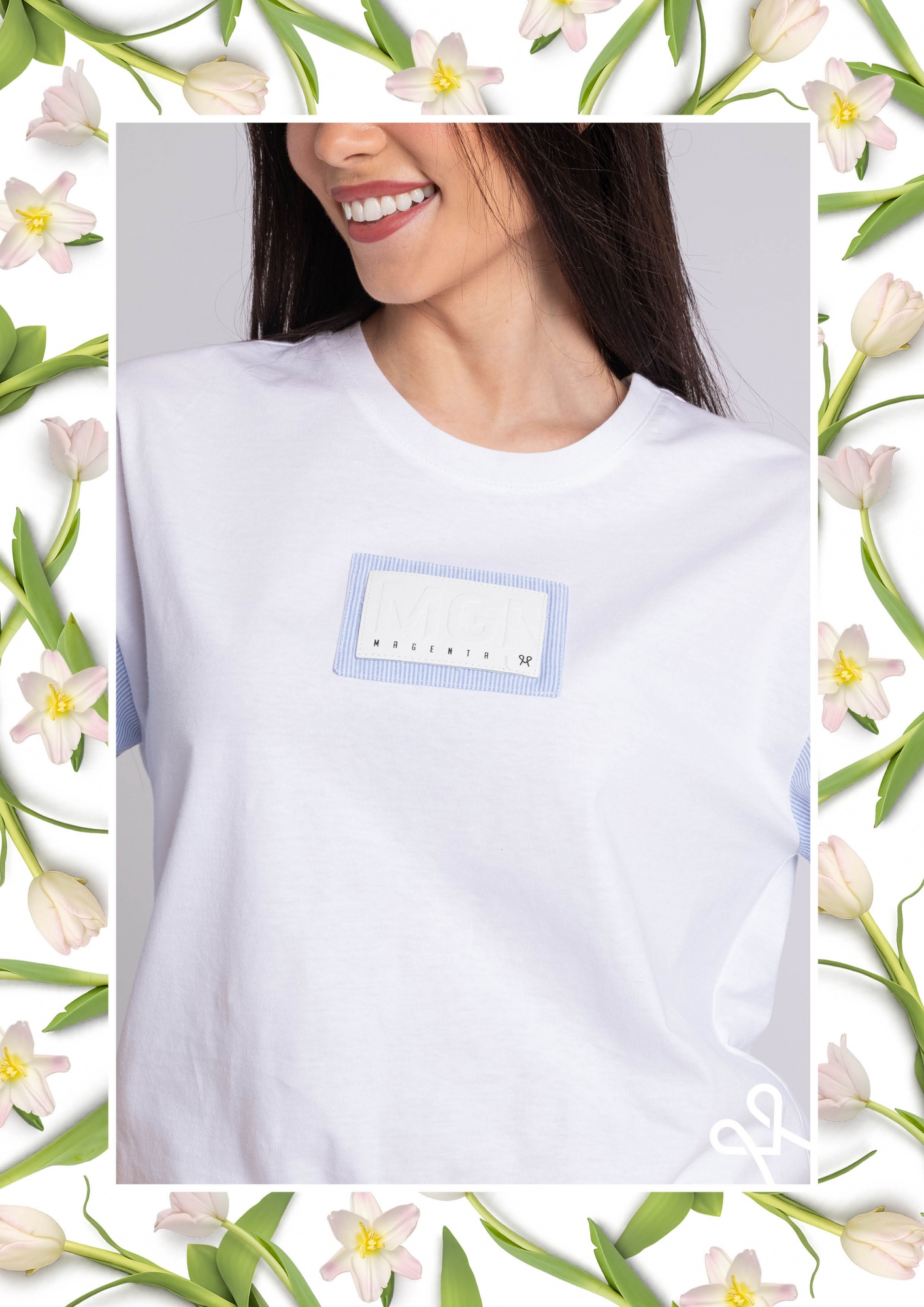 Laza, bő fazonú nyári póló kerek nyakkal és ejtett vállal, rövid ujjal, elején márkajelzéssel a könnyed, trendi megjelenésért.