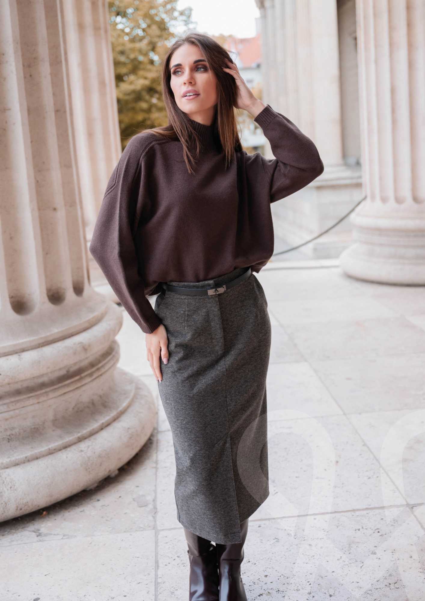 Kifinomult megjelenést kínál a szürke, szűk szabású, alakot követő ceruzaszoknya, amelyet elülső cipzáras és patentos záródása, oldalán kialakított zsebei, elegáns elülső slicce és a hátul gumírozott derékrész kényelme tesz teljessé.