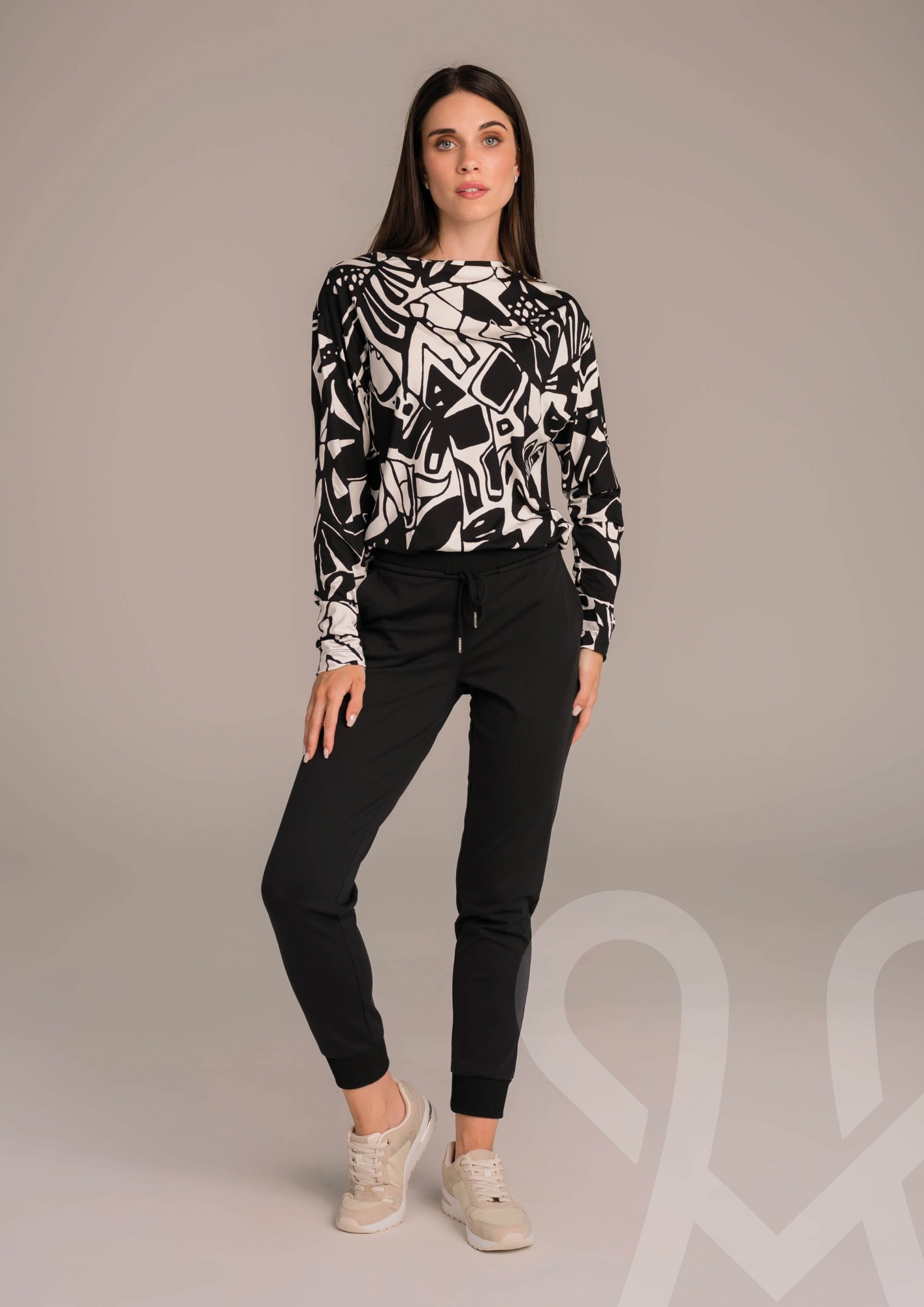 Lazább, bővebb fazonú felső kerek nyakkivágással, elasztikus viszkóz anyagból, fekete-fehér mintás dizájnnal – kényelmes és divatos választás minden alkalomra.