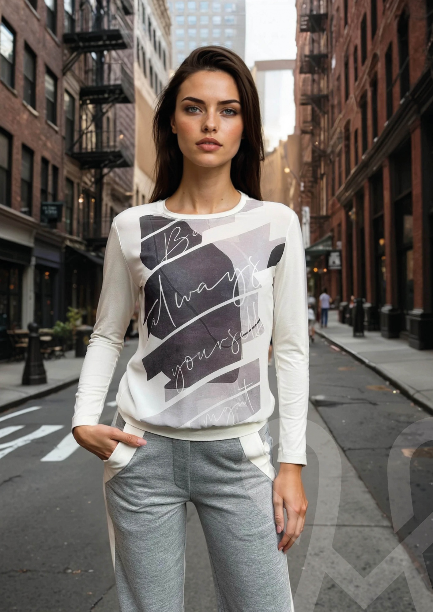Bővebb, lazább szabású női felső kerek nyakkivágással, hosszú ujjal és elején szublimációs díszítéssel a stílusos, kényelmes megjelenésért.