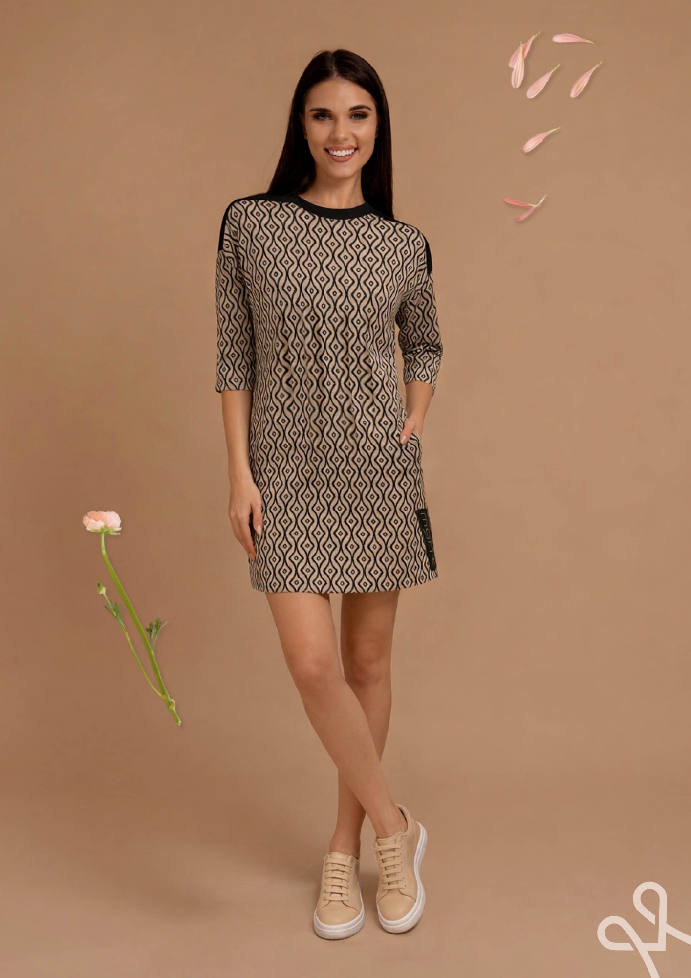Mintás, sportos stílusú női ruha egyenes, laza fazonnal, amelyet a nyakrészen fekete szegő díszít a modern és kényelmes tavaszi megjelenésért.
