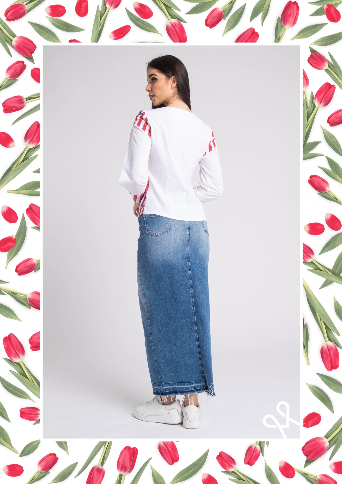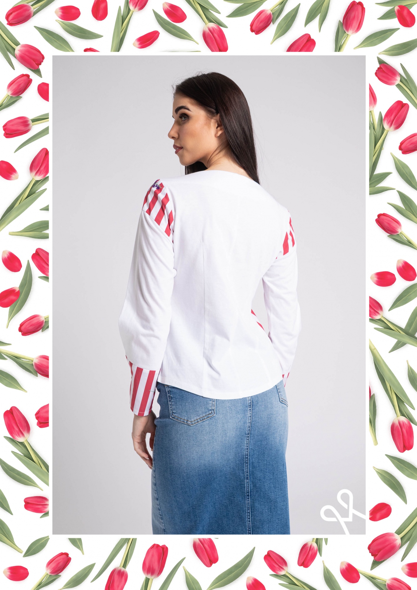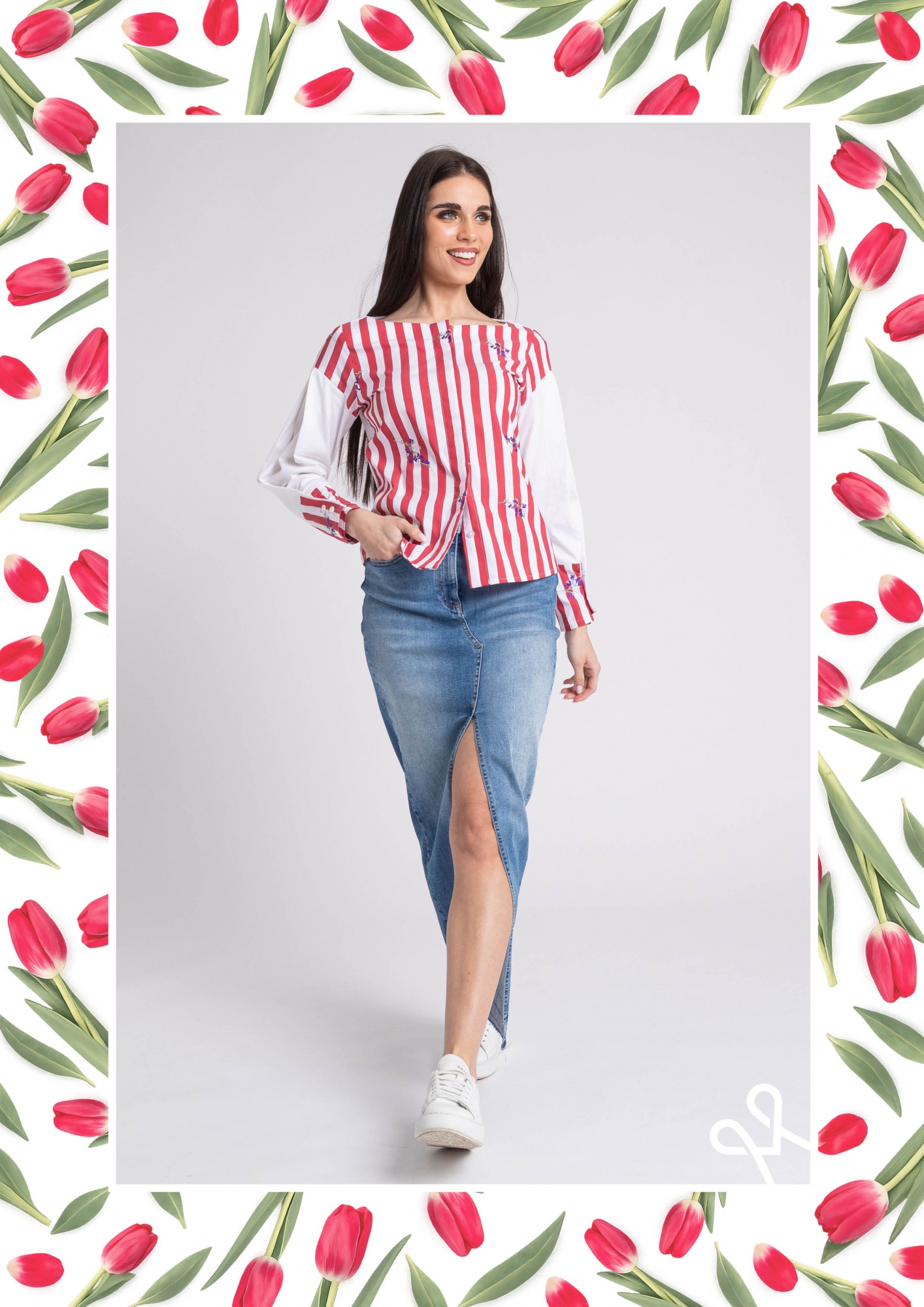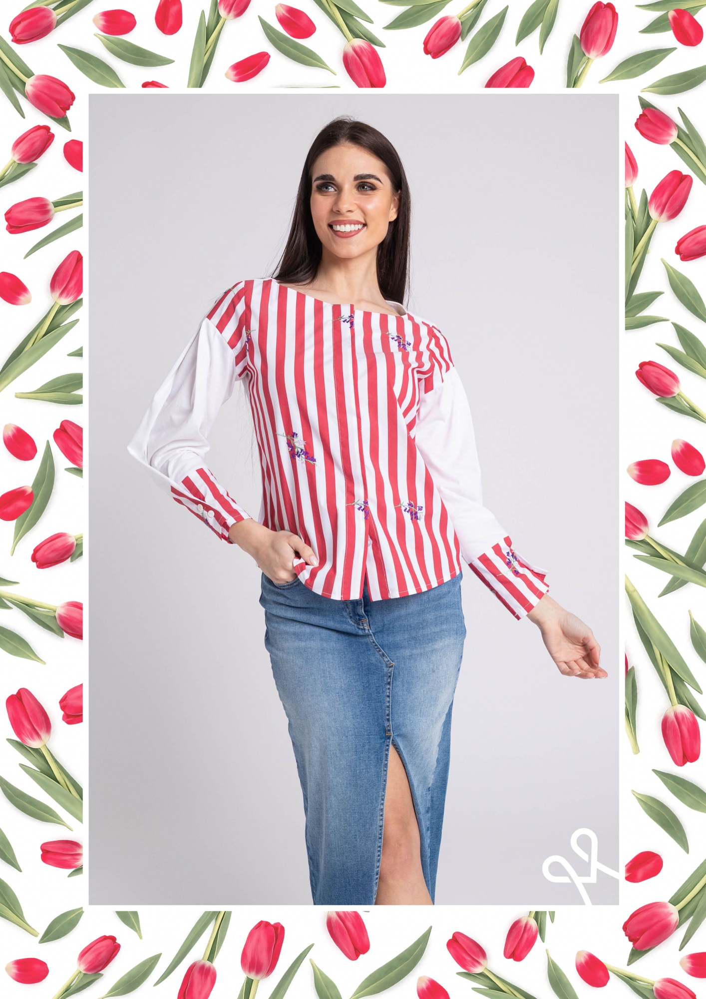 Alakot követő, szűkített nyári blúz gombos záródással, foltzsebbel masnival, hosszú ujjjal és széles, gombolható mandzsettával a nőies, elegáns megjelenésért.