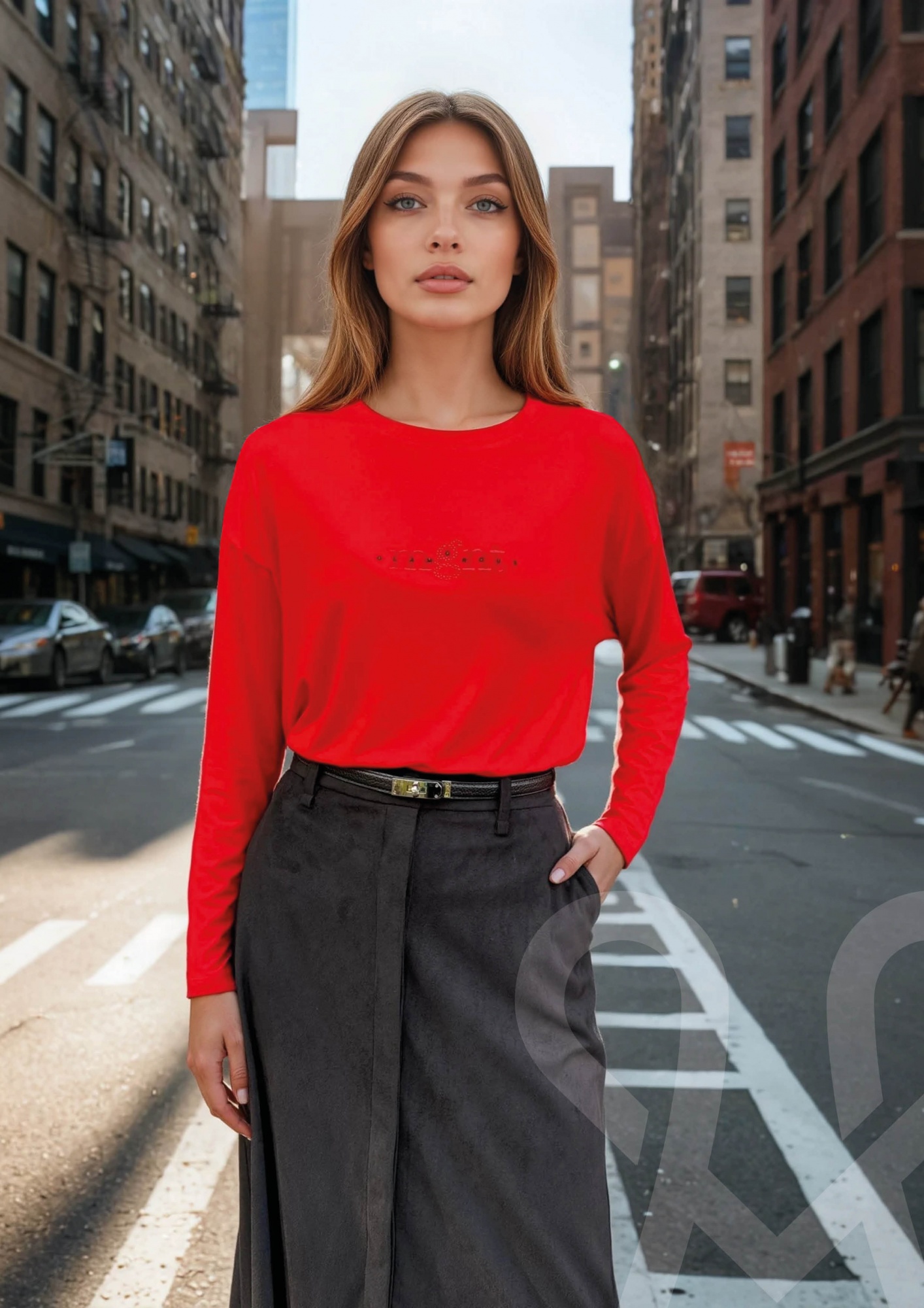 Piros színű, Magenta felső, laza fazonú, hosszú ujjal. Elején filmnyomott Magenta márkajelzés.