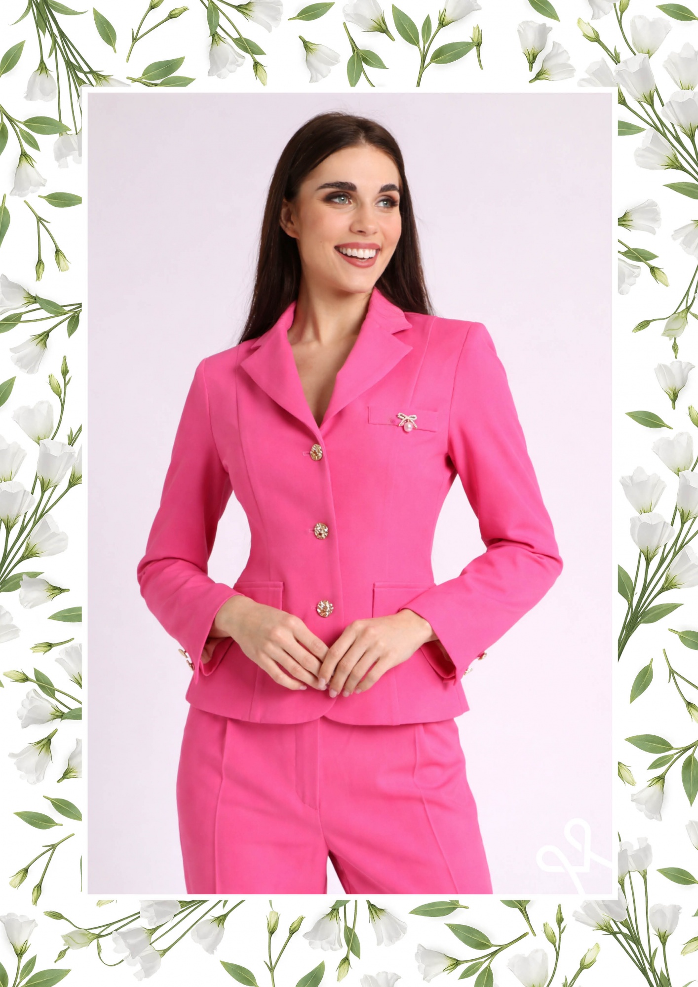 Rózsaszín, karcsúsított fazonú női zakó fazonos kihajtós gallérral, elején szivarzsebbel és zsebfedős zsebekkel díszítve, amely elegáns és stílusos tavaszi viselet.