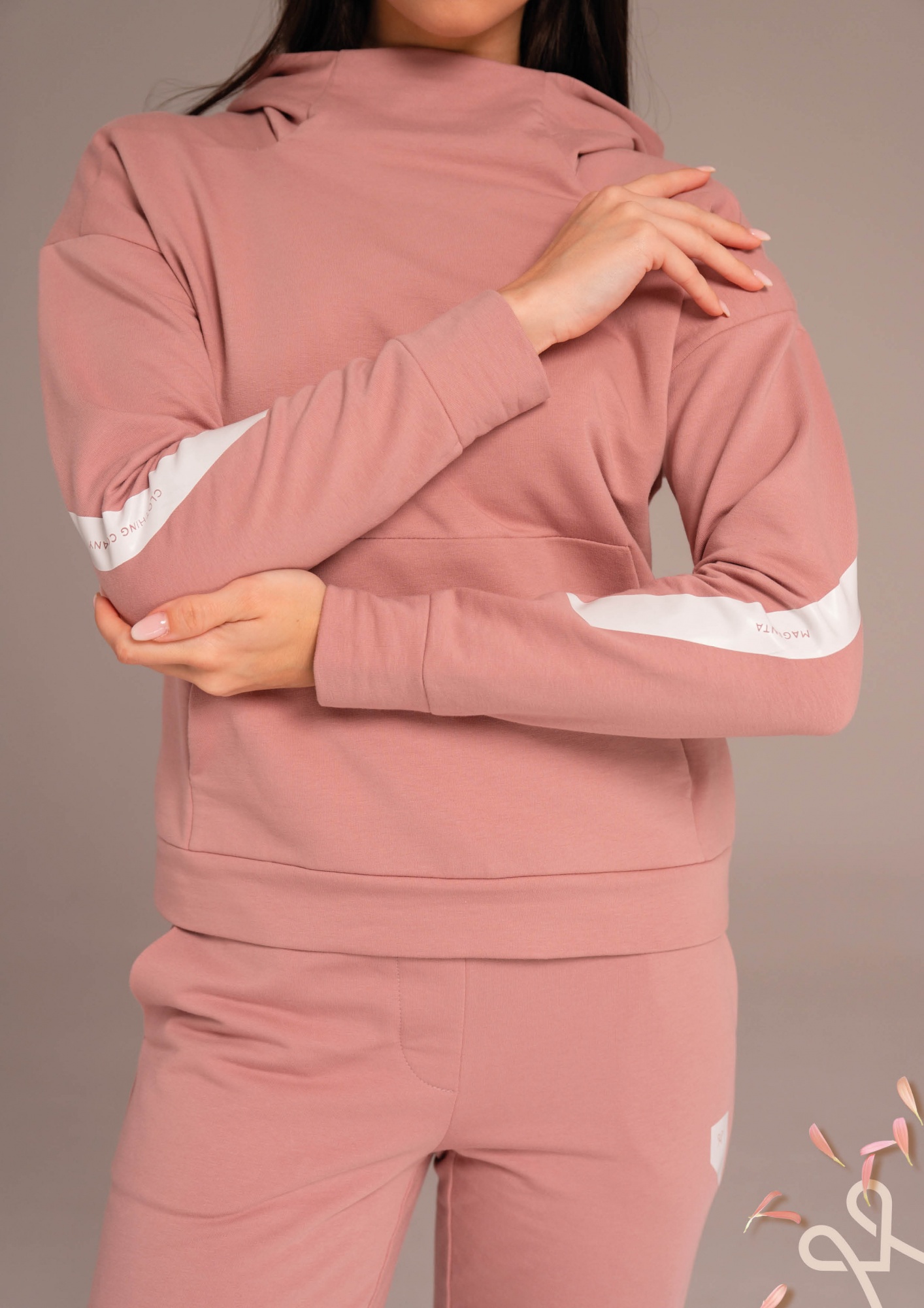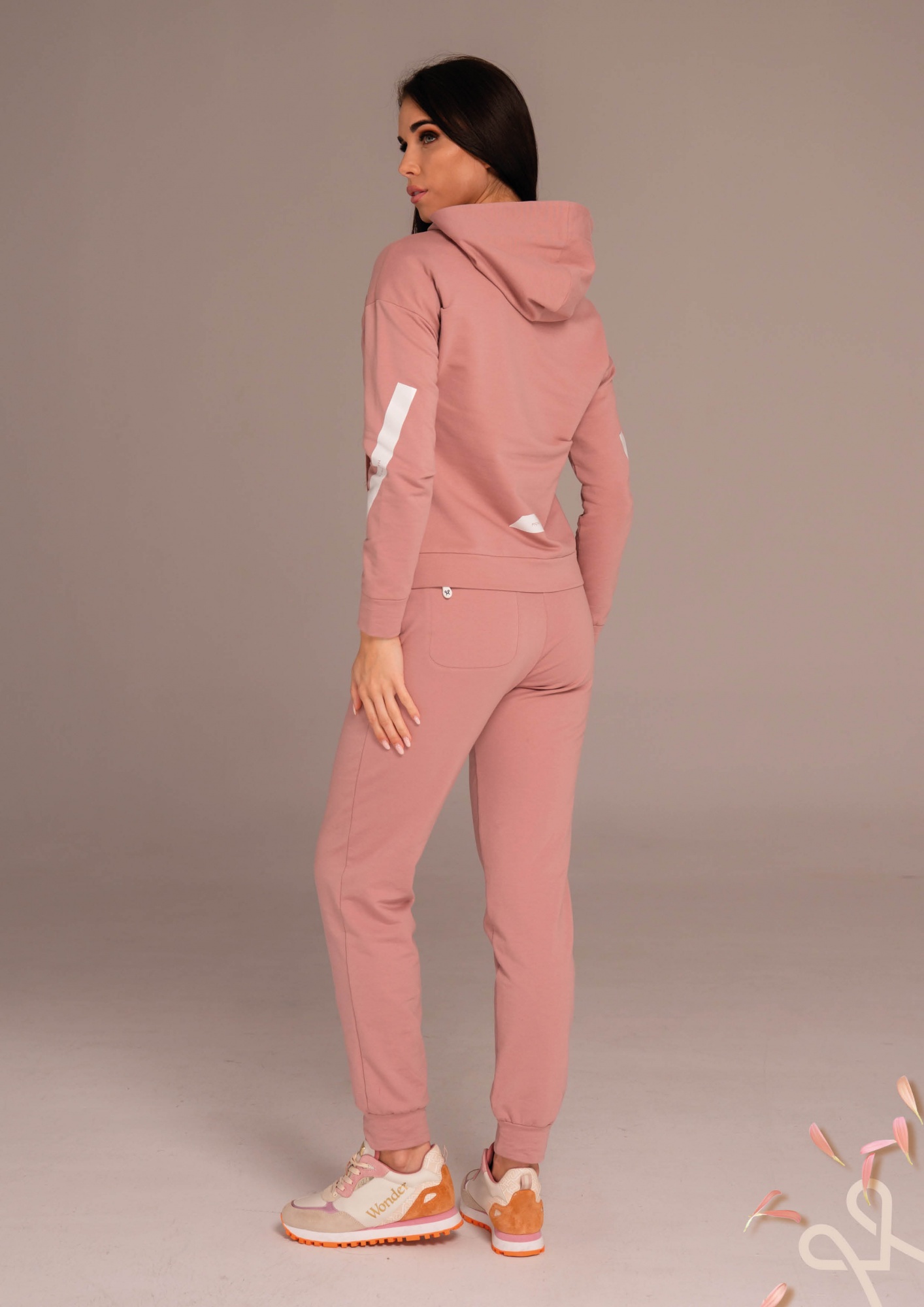 Rózsaszín, szűkülő fazonú sportos pamut nadrág enyhén elasztikus anyagból, derekán megkötővel és oldalzsebekkel a kényelmes, sportos tavaszi viseletért.