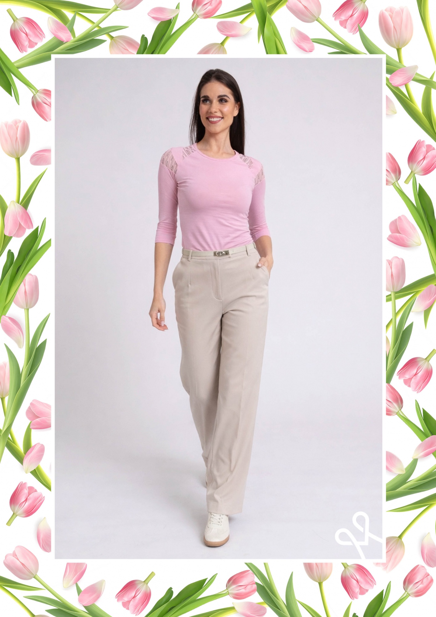 Alakot követő, szűk nyári viszkóz felső rózsaszínben, hosszú ujjjal, kerek nyakkal, vállán és hátán tüll részletekkel és márkajelzéssel a nőies, elegáns megjelenésért.