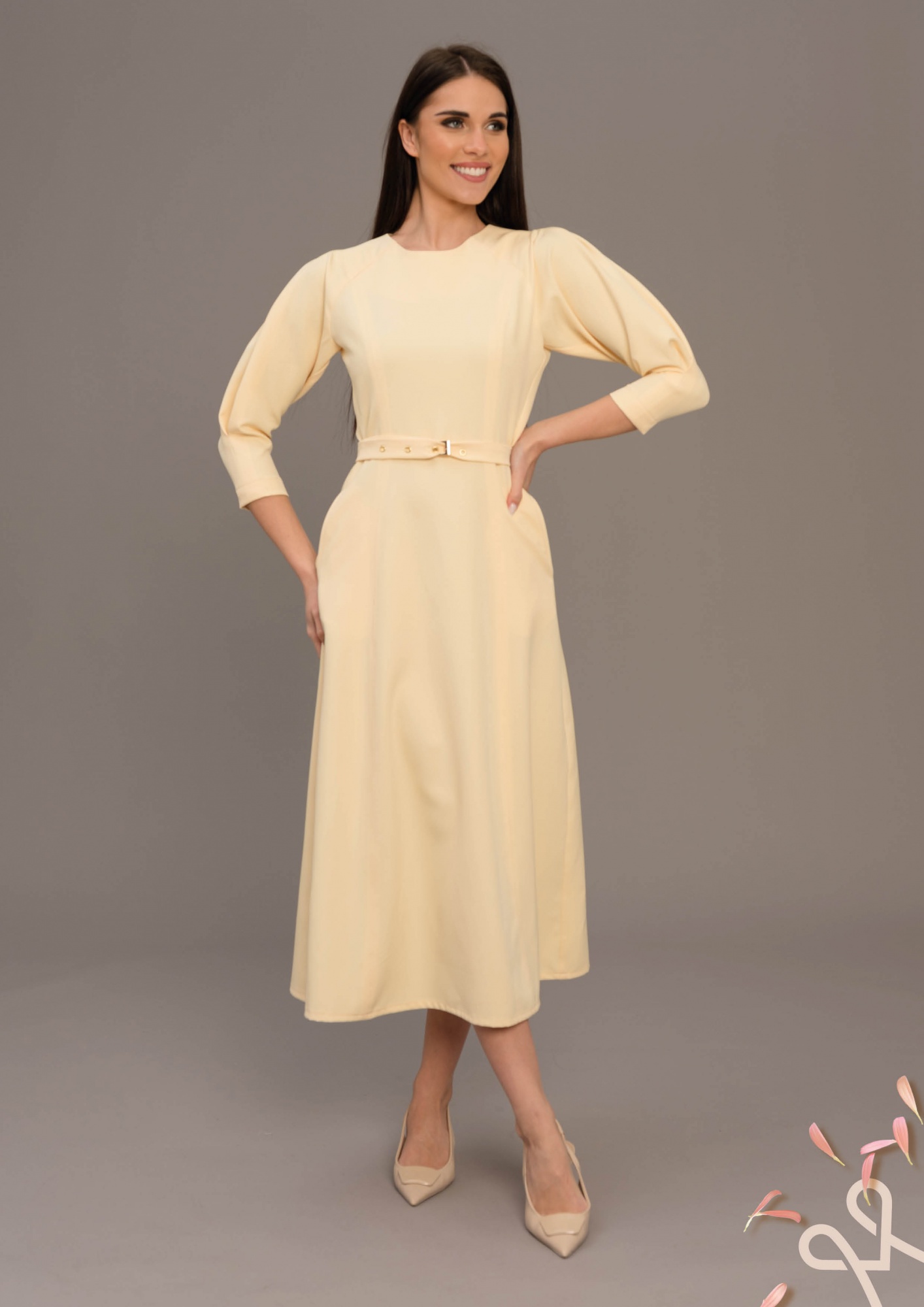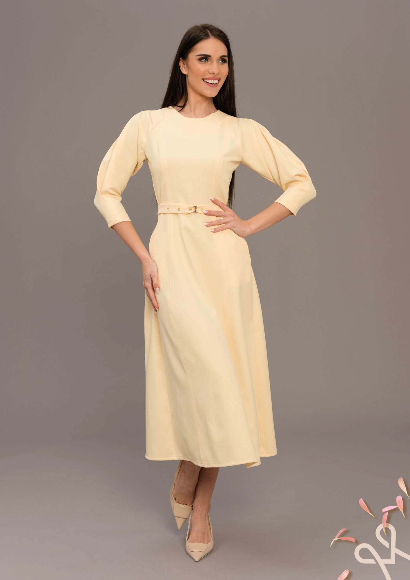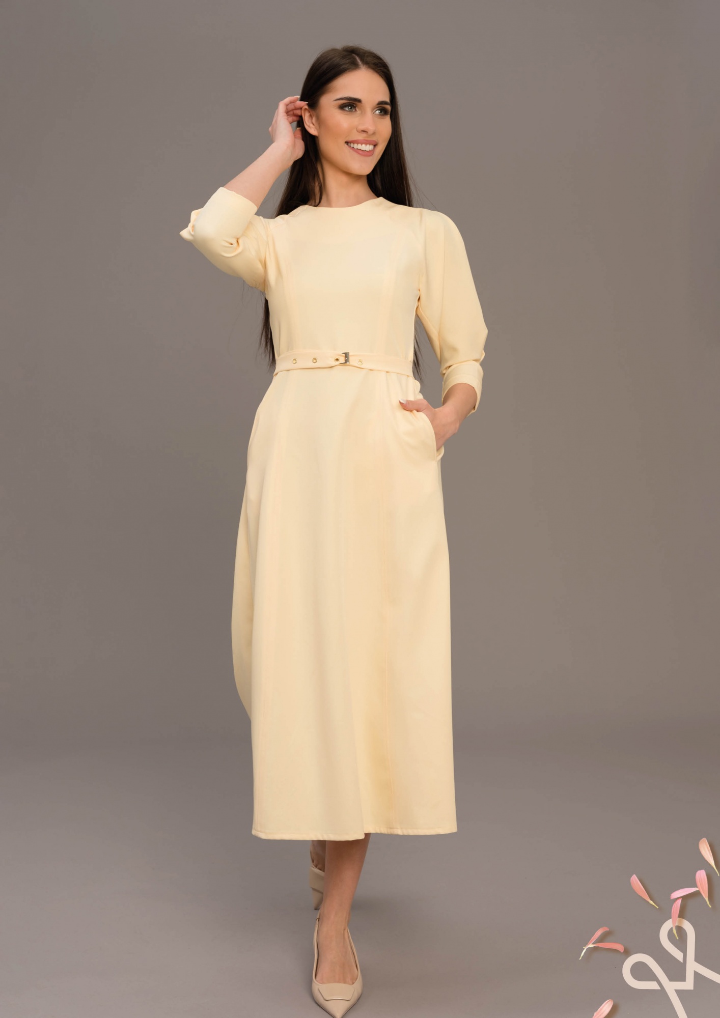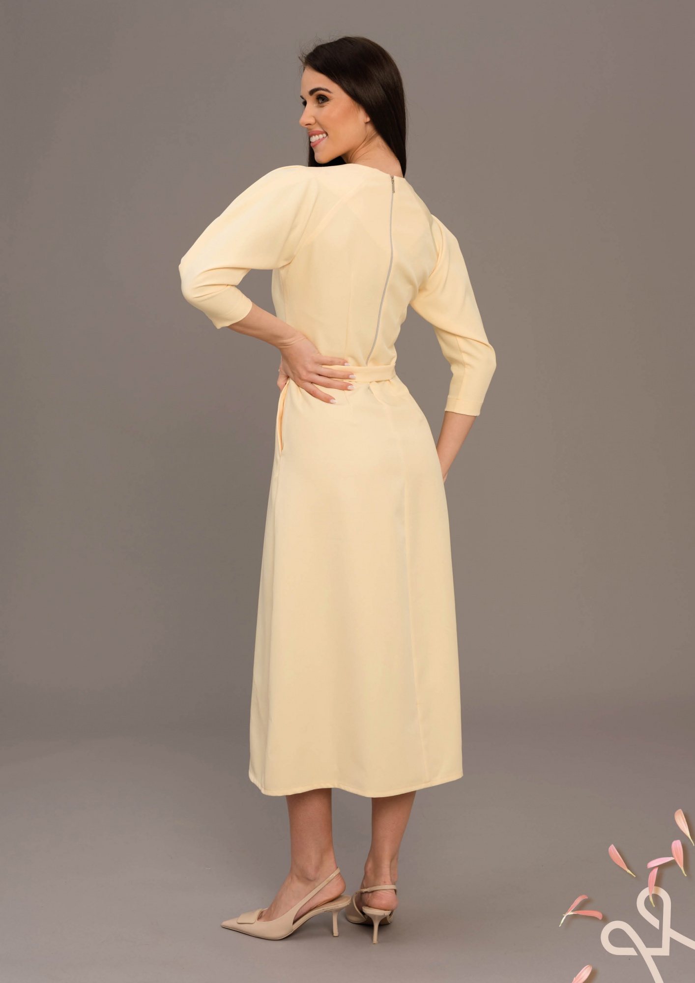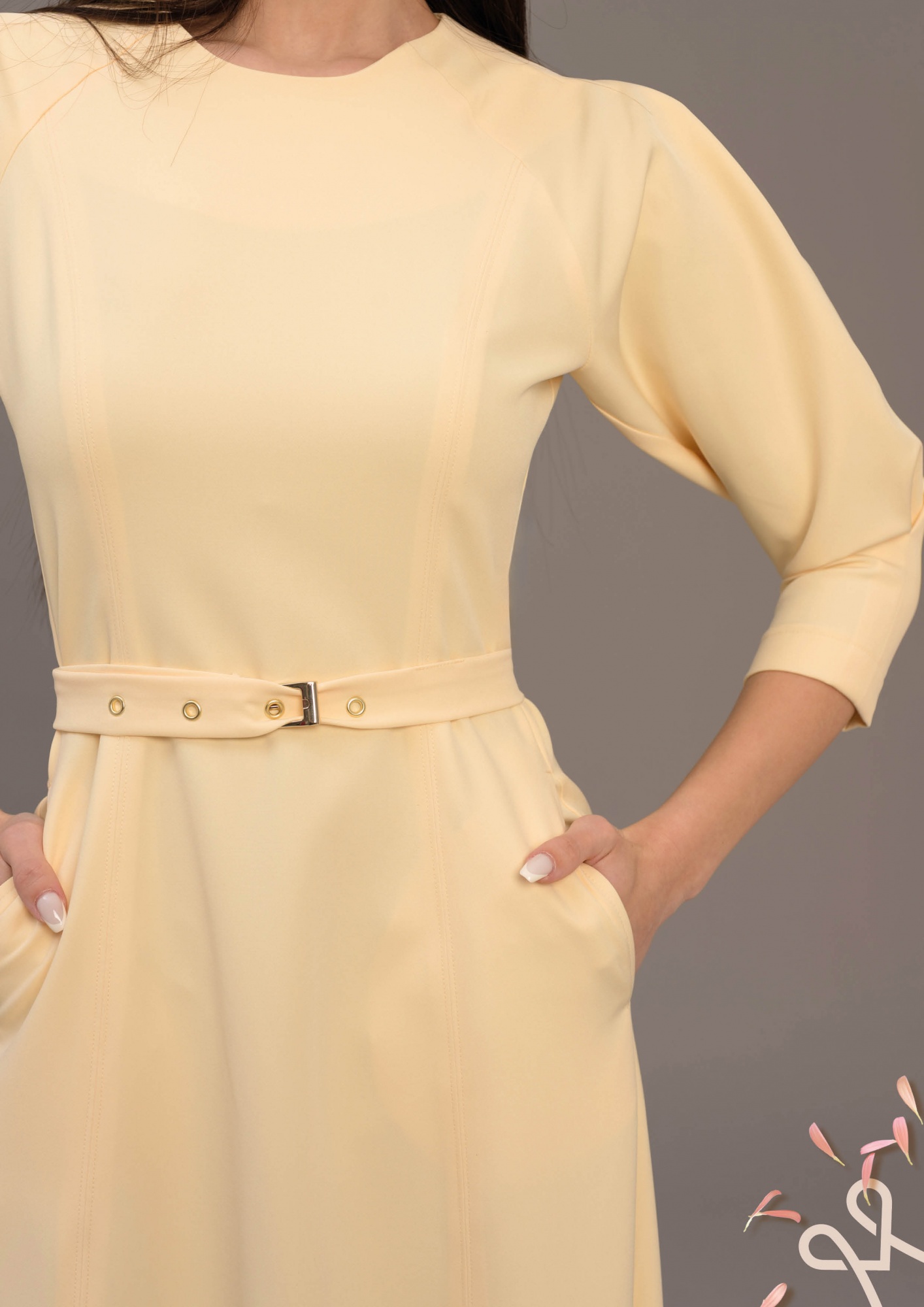 Sárga színű, A-vonalú, elasztikus puntó női ruha térd alá érő fazonnal, raglán ujjal és hajtásokkal díszített részletekkel, hátán cipzárral záródik, amely elegáns és stílusos tavaszi viselet.