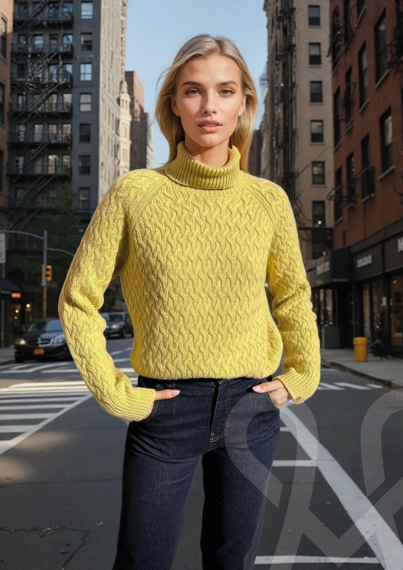 Meleg, vastagabb kötésű, lazább fazonú pulóver, amely kényelmes viseletet biztosít a hidegebb napokon. Elasztikus anyaga rugalmasan illeszkedik, garbós nyakrésszel készült a még nagyobb komfortért. Sárga színe vidám, stílusos megjelenést kölcsönöz, tökéletes választás hétköznapi vagy alkalmi öltözékhez.