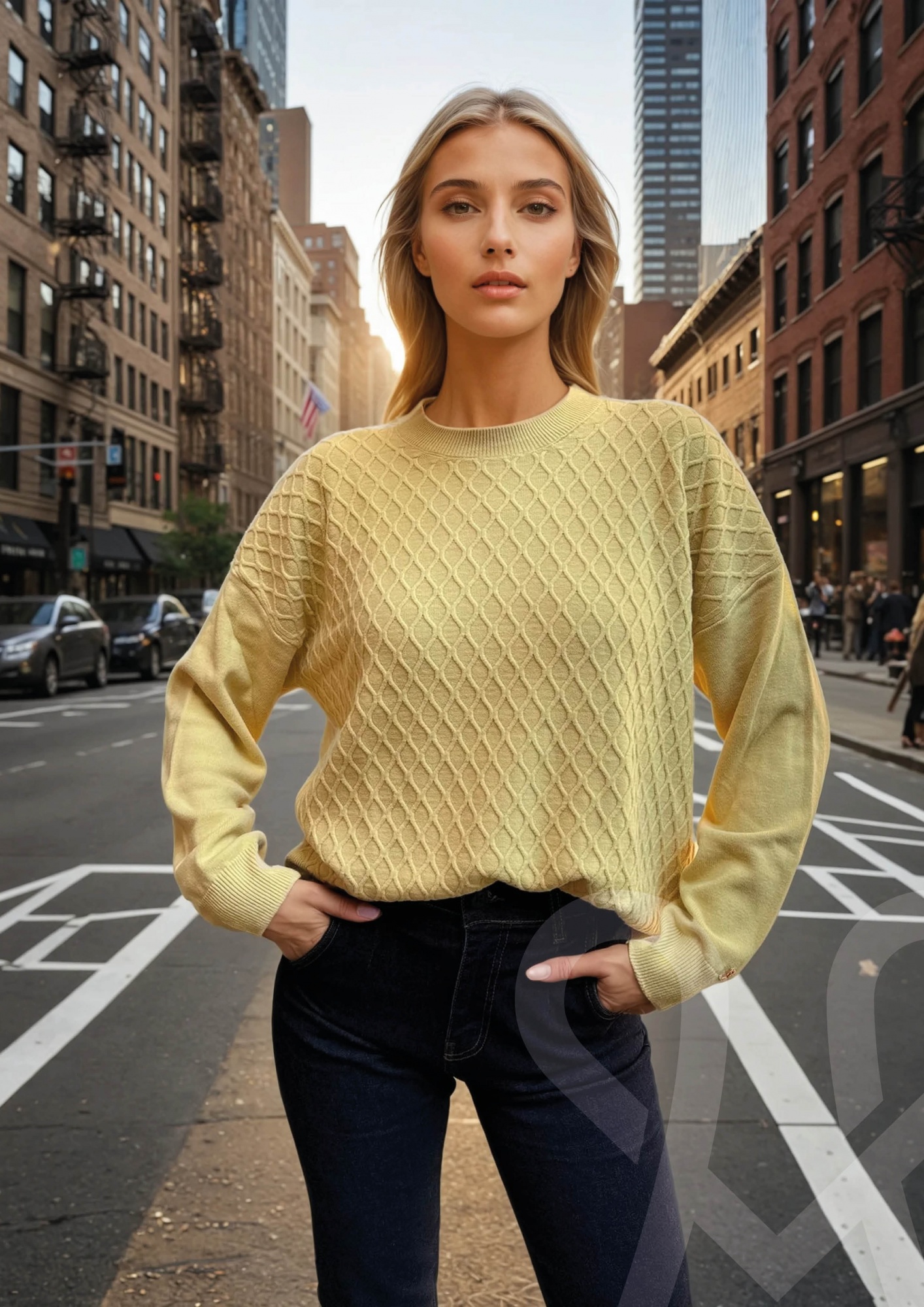 Sárga színű, Magenta kötött pulóver, kerek nyakkivágással. Oldalán rávarrt textil Magenta márkajelzés. A felső egyméret méretben kélszült.