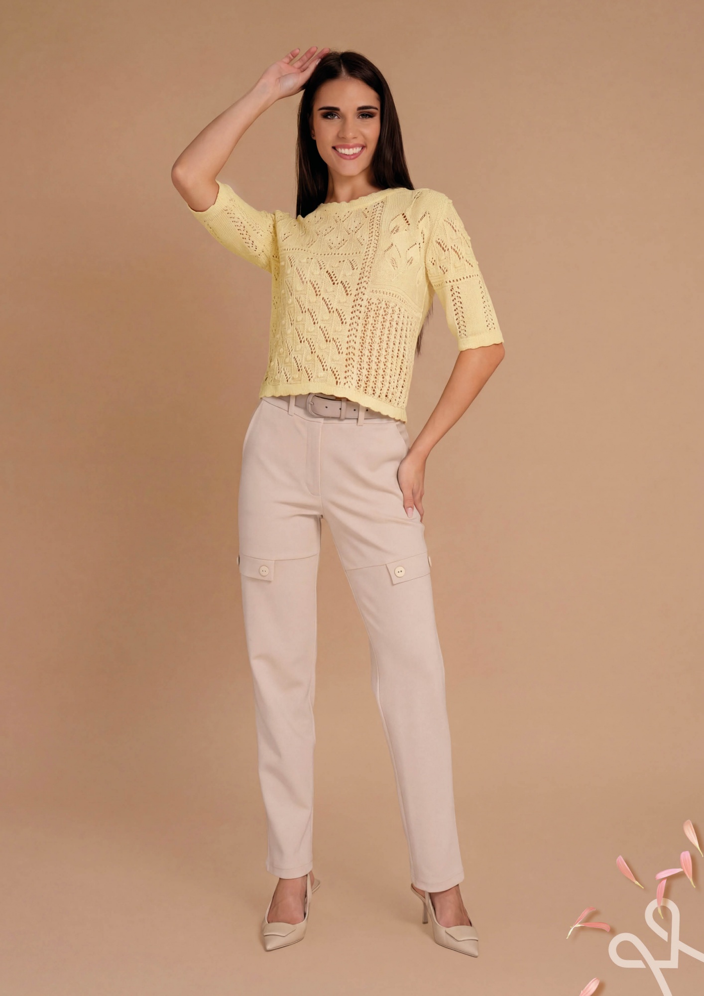 Sárga színű, szűkebb és alakot követő fazonú, vékony kötésű, elasztikus pulóver kerek nyakkivágással és rövid ujjal, amely letisztult, nőies megjelenést biztosít.