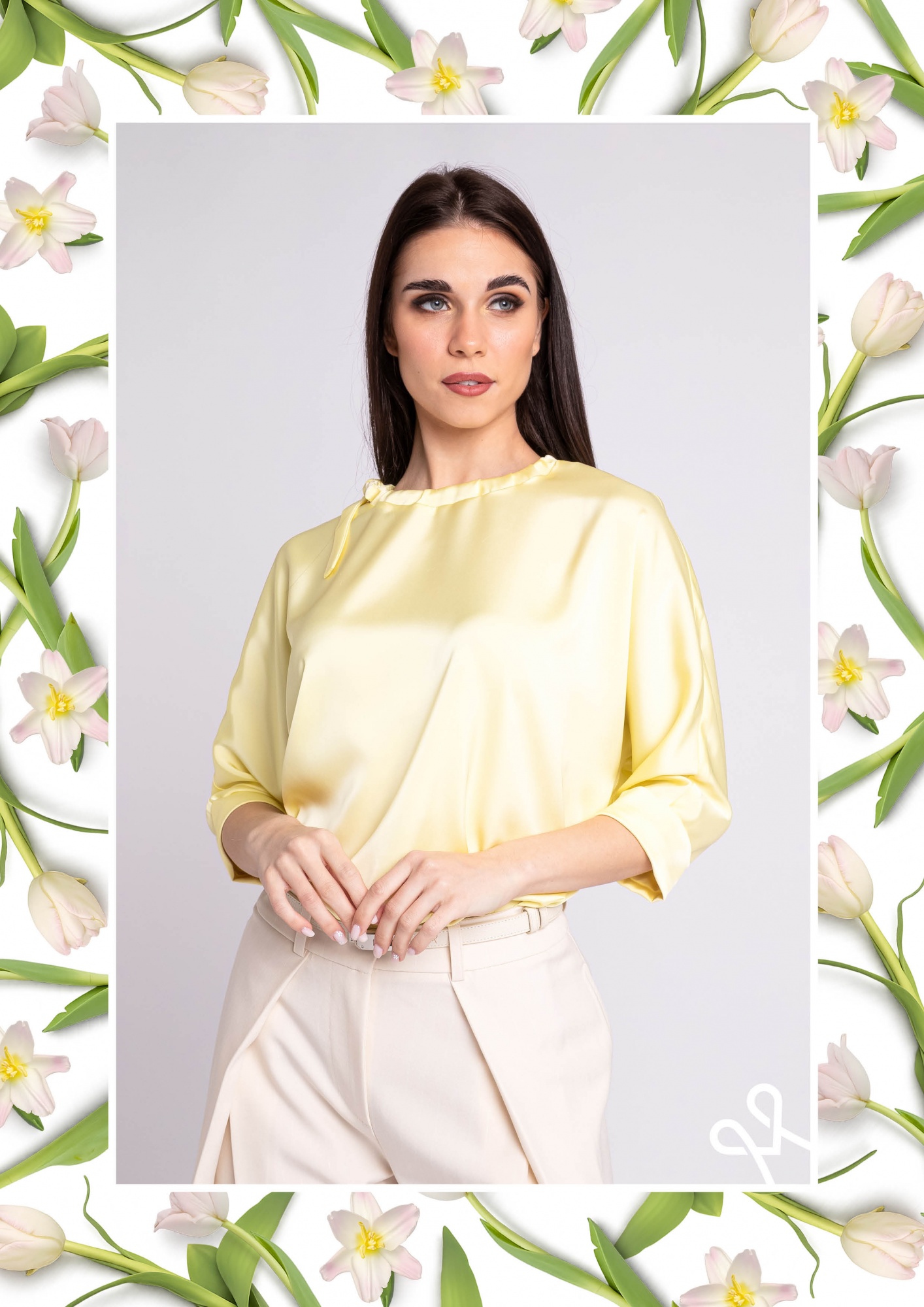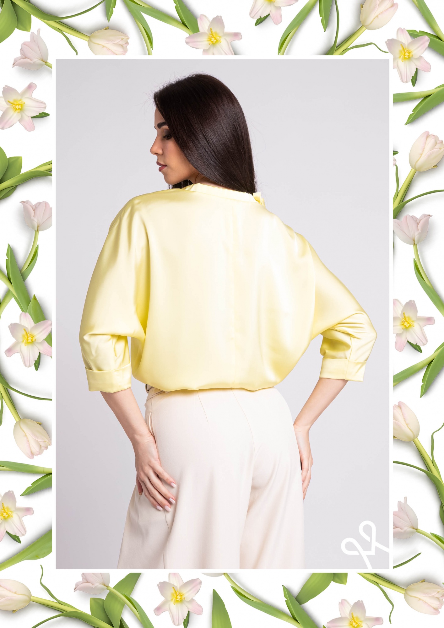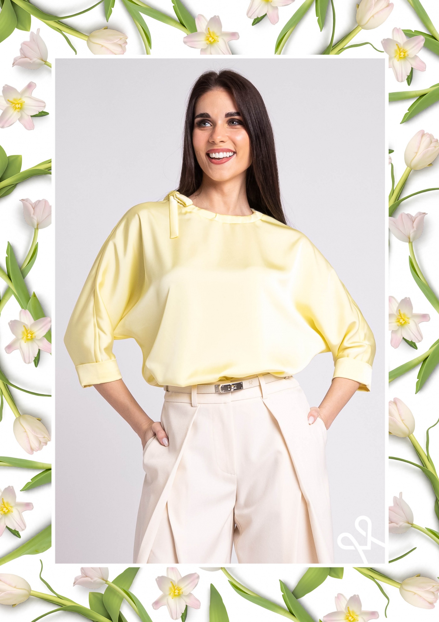 Sárga színű, bő szabású, lazább női felső kerek nyakkivágással és nyakrészen megkötővel, amely könnyed és nőies tavaszi viselet.
