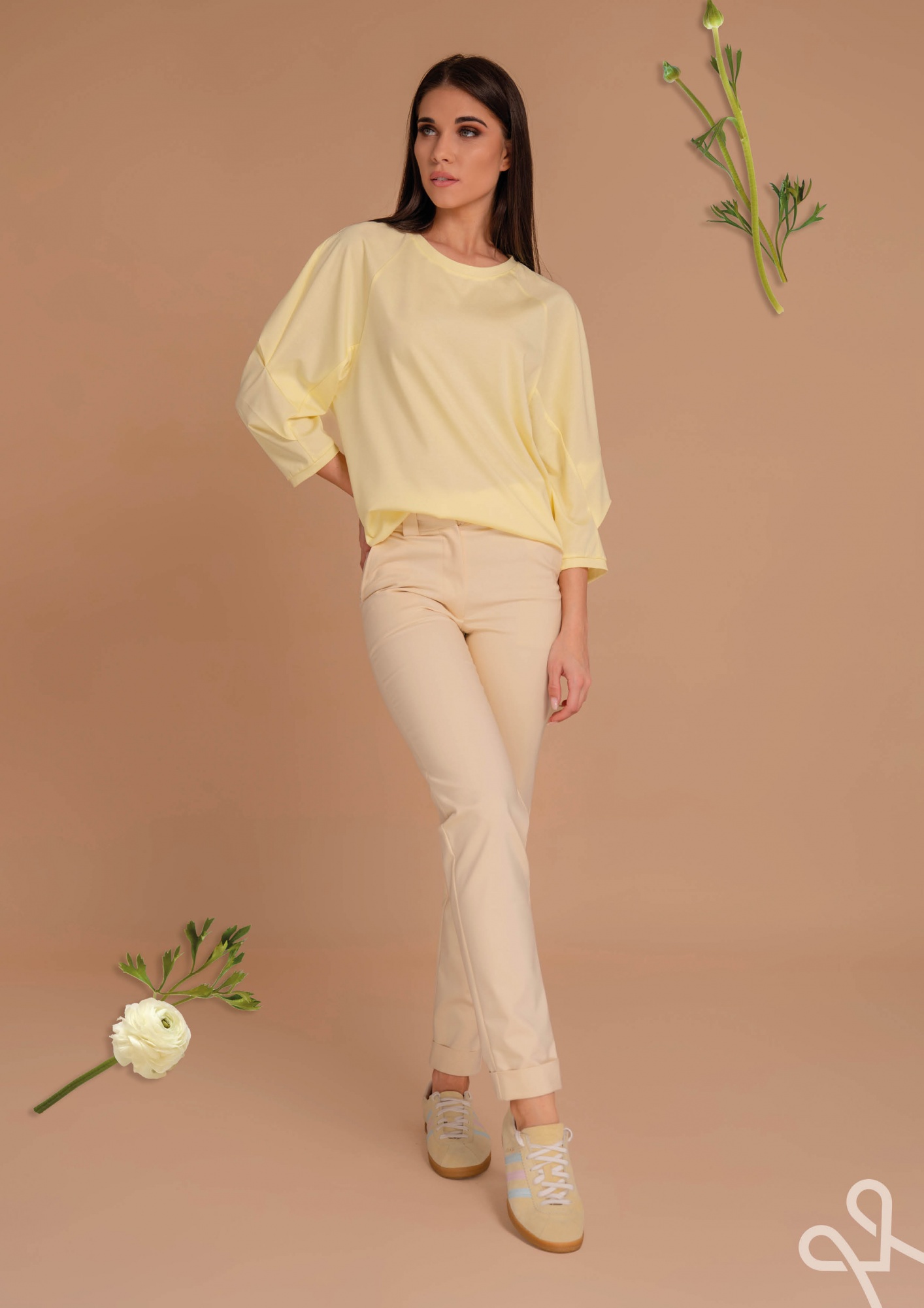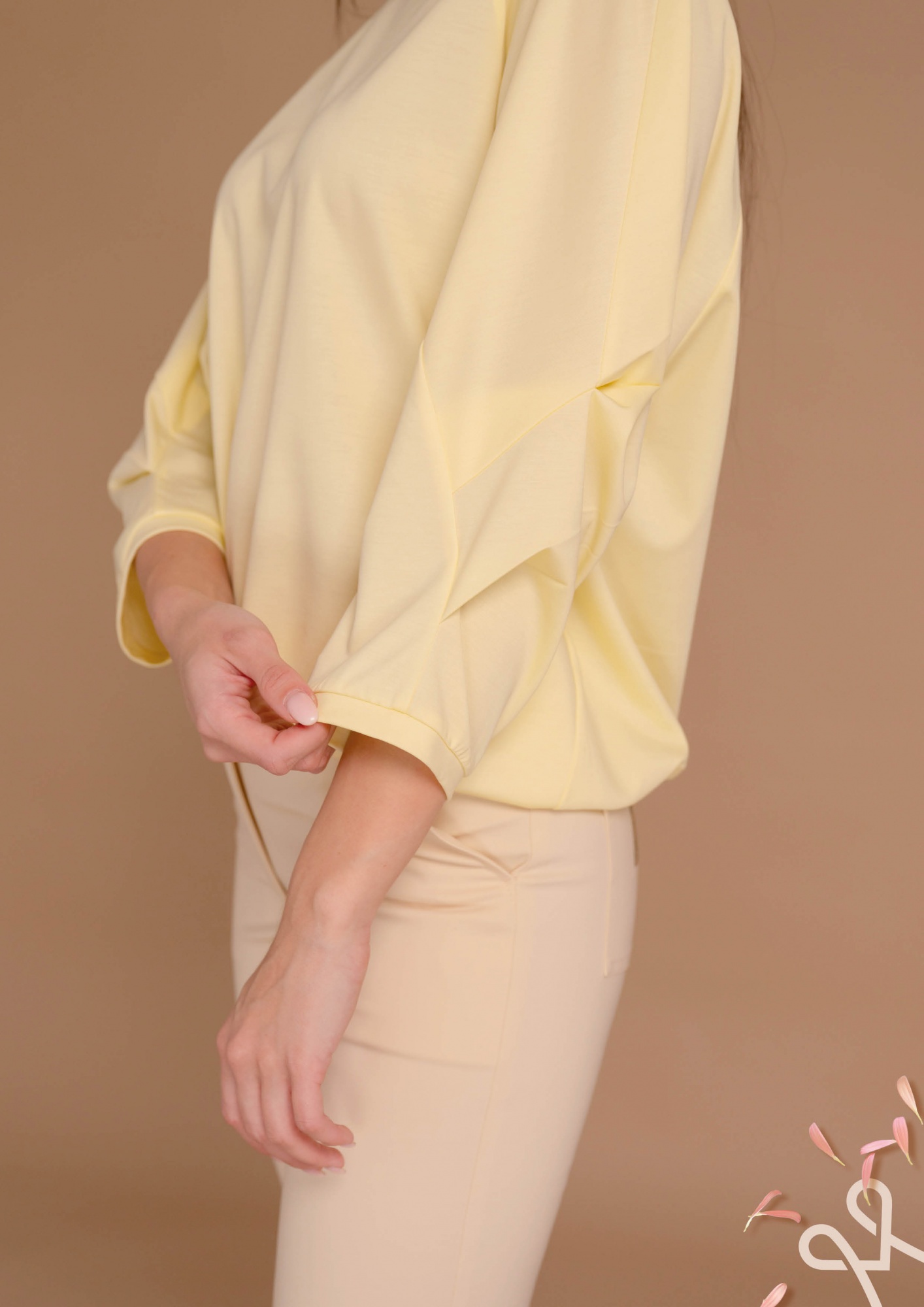 Sárga színű, bővebb, lazább szabású női felső kevert szálas anyagból, kerek nyakkivágással és ujján hajtásokkal díszített részlettel, amely nőies és stílusos tavaszi viselet.