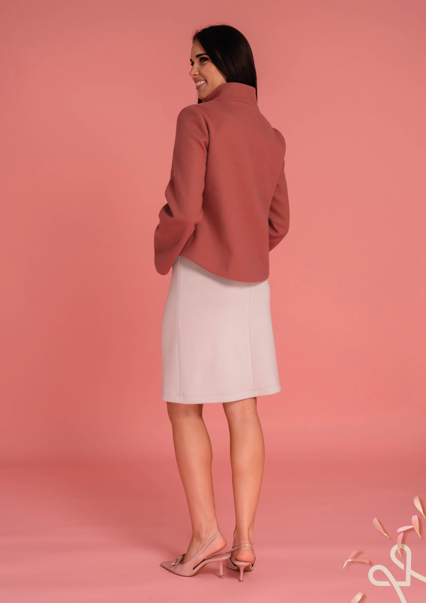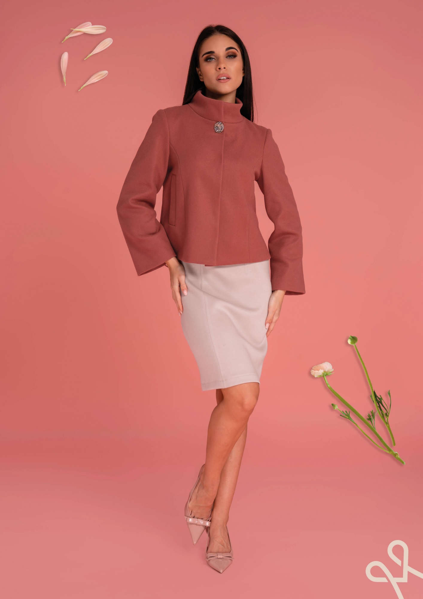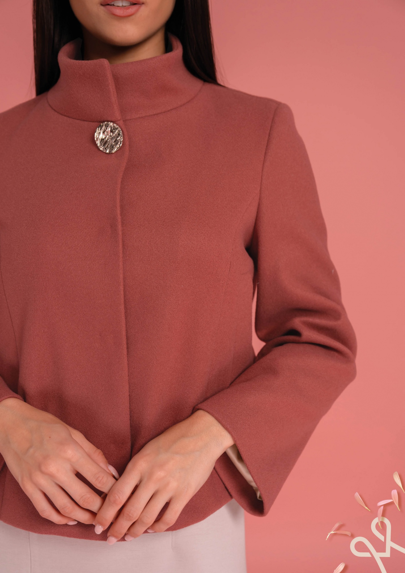 Sötét mályva színű, enyhén bővülő, rövid fazonú kabát magas álló gallérral, 1 díszgombbal és belül 3 rejtett gombbal díszítve, amely elegáns és stílusos tavaszi viseletet biztosít.