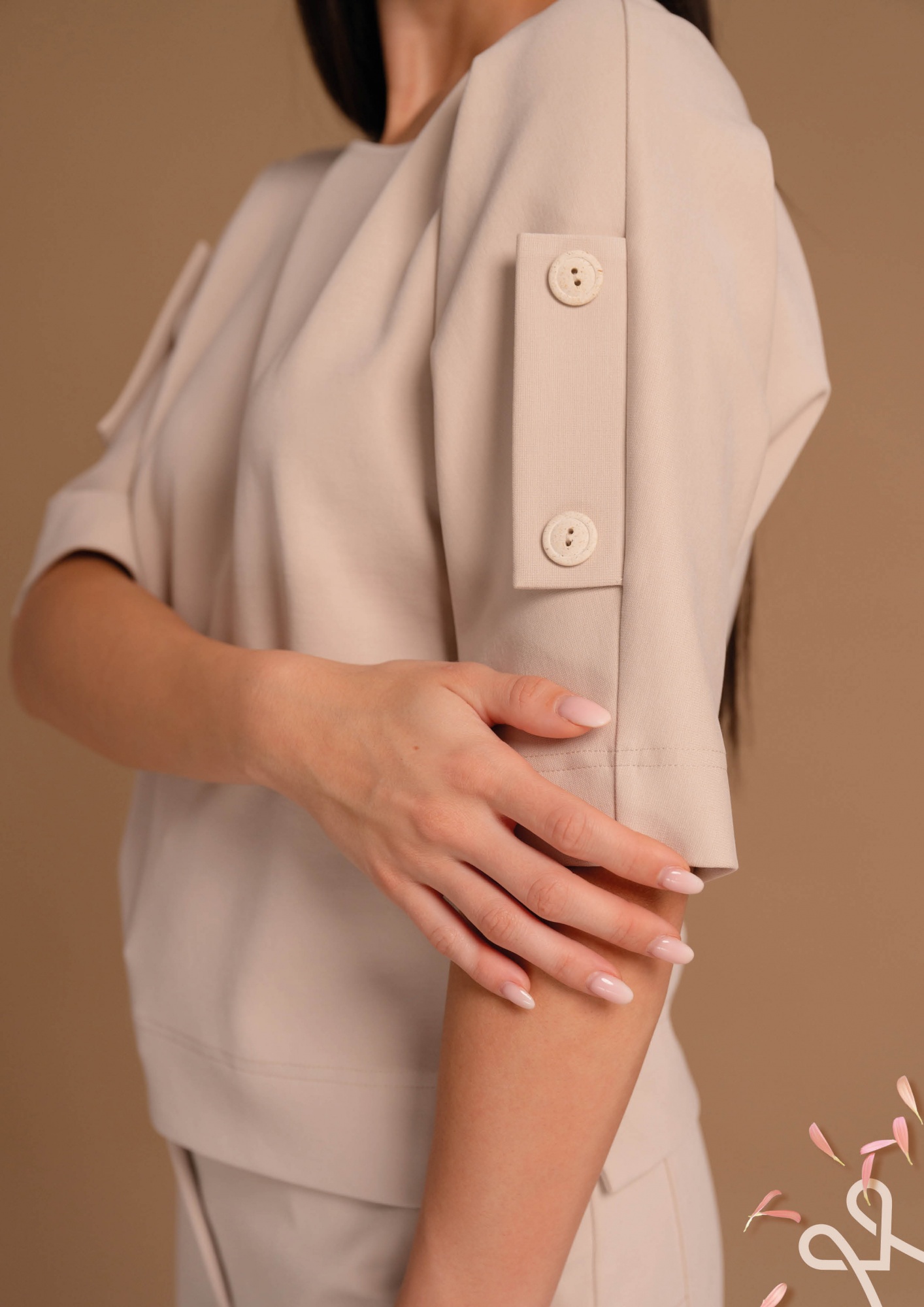 Világos bézs színű, bővebb és lazább fazonú kevert szálas felső 3/4 hosszú ujjal, amelyet az ujjakon megjelenő zsebfedős és gombos részletek tesznek különlegessé.
