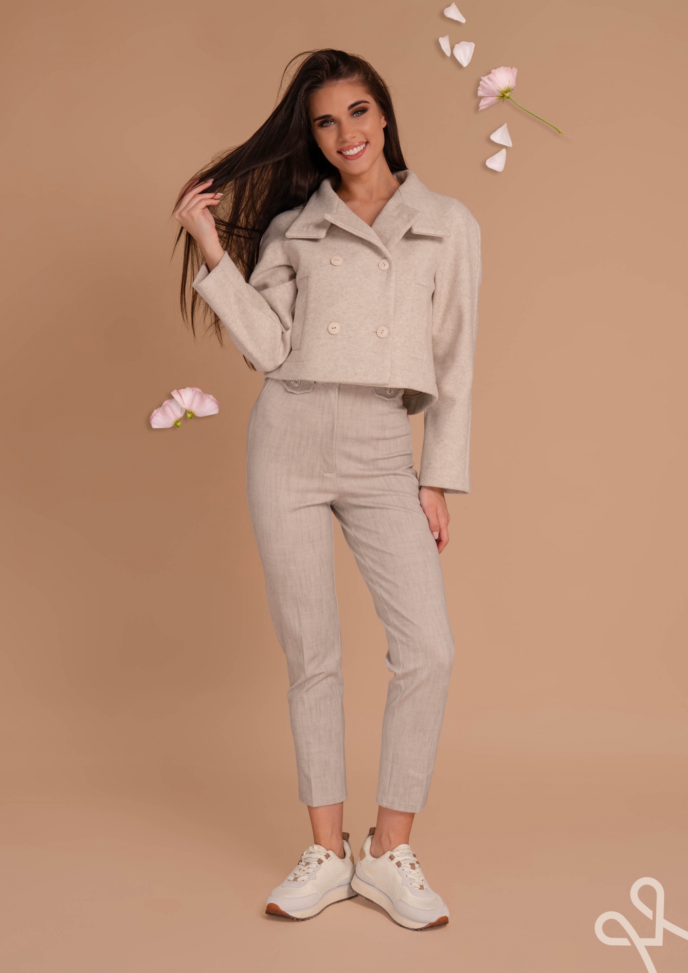 Bézs színű, szűkülő szárú elasztikus puntó nadrág elegáns élvasalással, praktikus oldalzsebekkel és elöl cipzáras záródással a kifinomult, kényelmes viseletért.