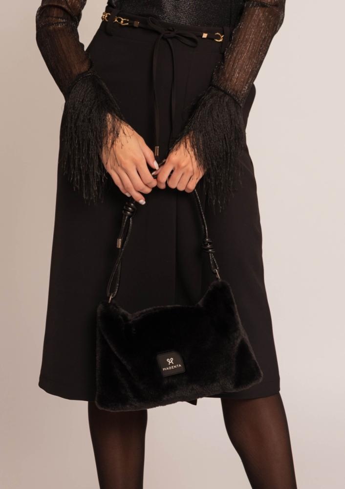 Fekete színű, Magenta szőrmés kistáska, műbőr vállpánttal, zippzáras záródással. Elején rávarrt Magenta márkajelzés.