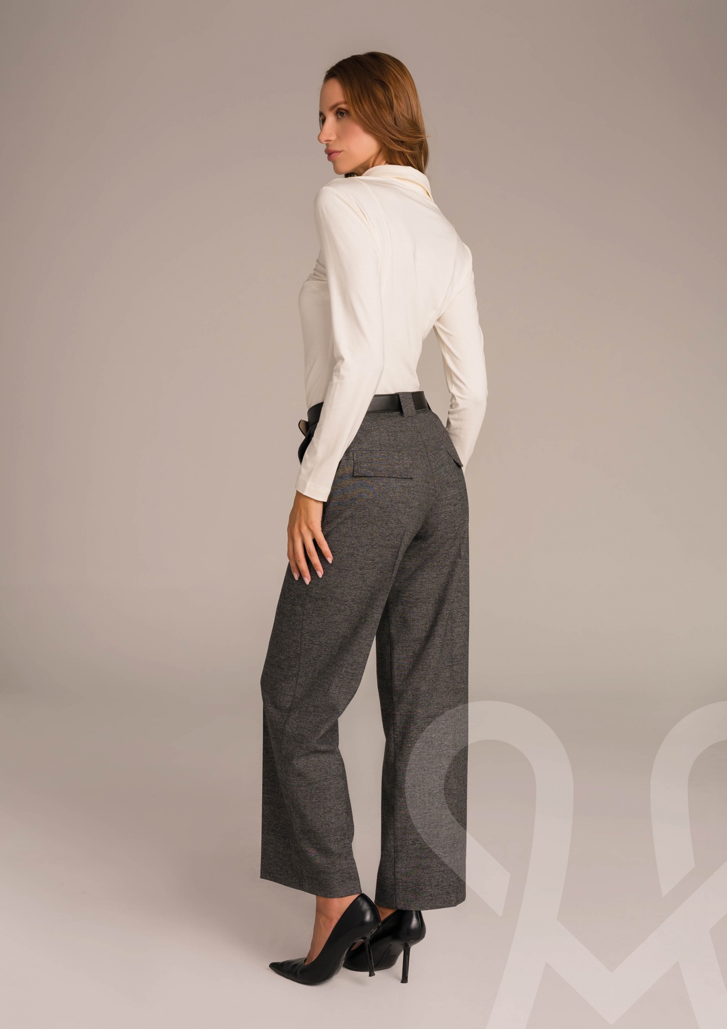 Ez a Magenta termék egy bővebb szárú, szürke szövet nadrág, amely elegáns élvasalással, elöl gombos és cipzáras záródással, valamint praktikus oldalzsebekkel készült, stílusos megjelenést és kényelmes viseletet kínálva.