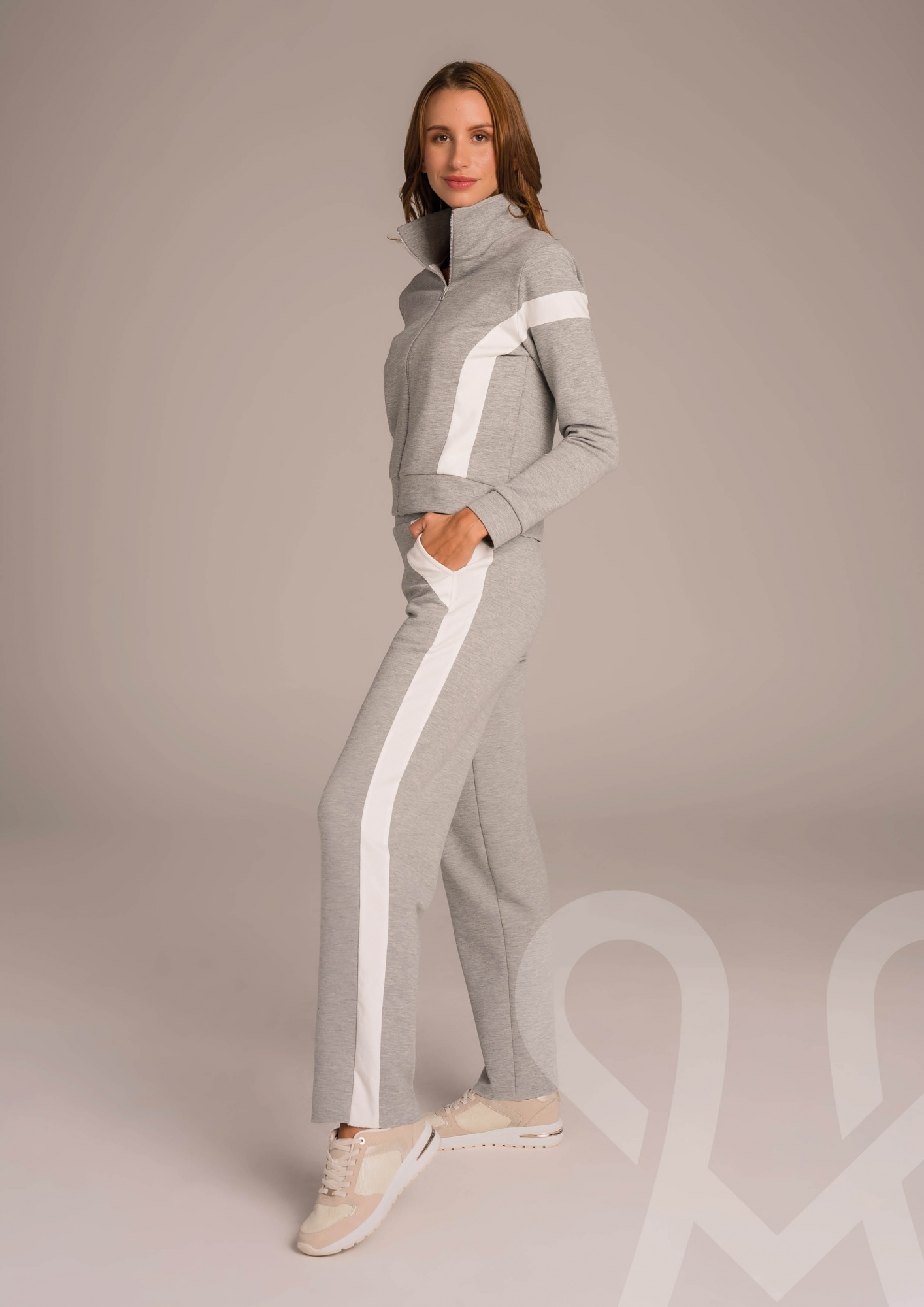 Kényelmes, lazább szabású, elasztikus melegítő felső sportos fazonban.