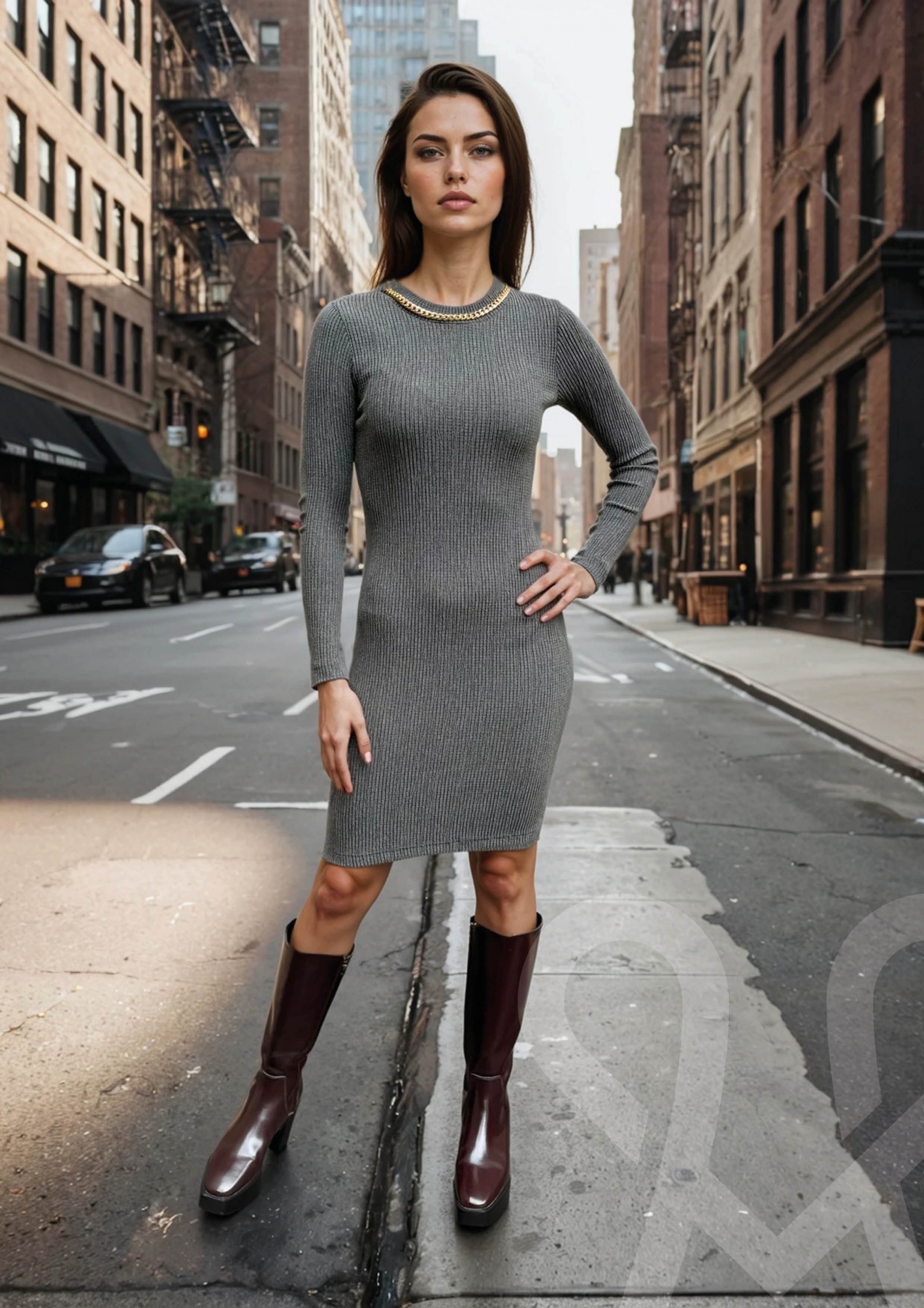 Szürke színű, elasztikus kevert szálas Magenta ruha, szűk fazonú, kerek nyakkivágással és lánccal díszített. Oldalán rávarrt textil Magenta márkajelzés.