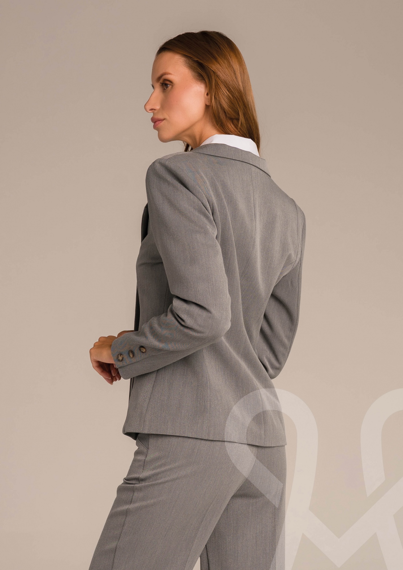 Karcsúsított fazonú, szürke színű Magenta szövet zakó aszimmetrikus, átlapolt gombolással és fazonos, széles lehajtós gallérral az elegáns megjelenésért.