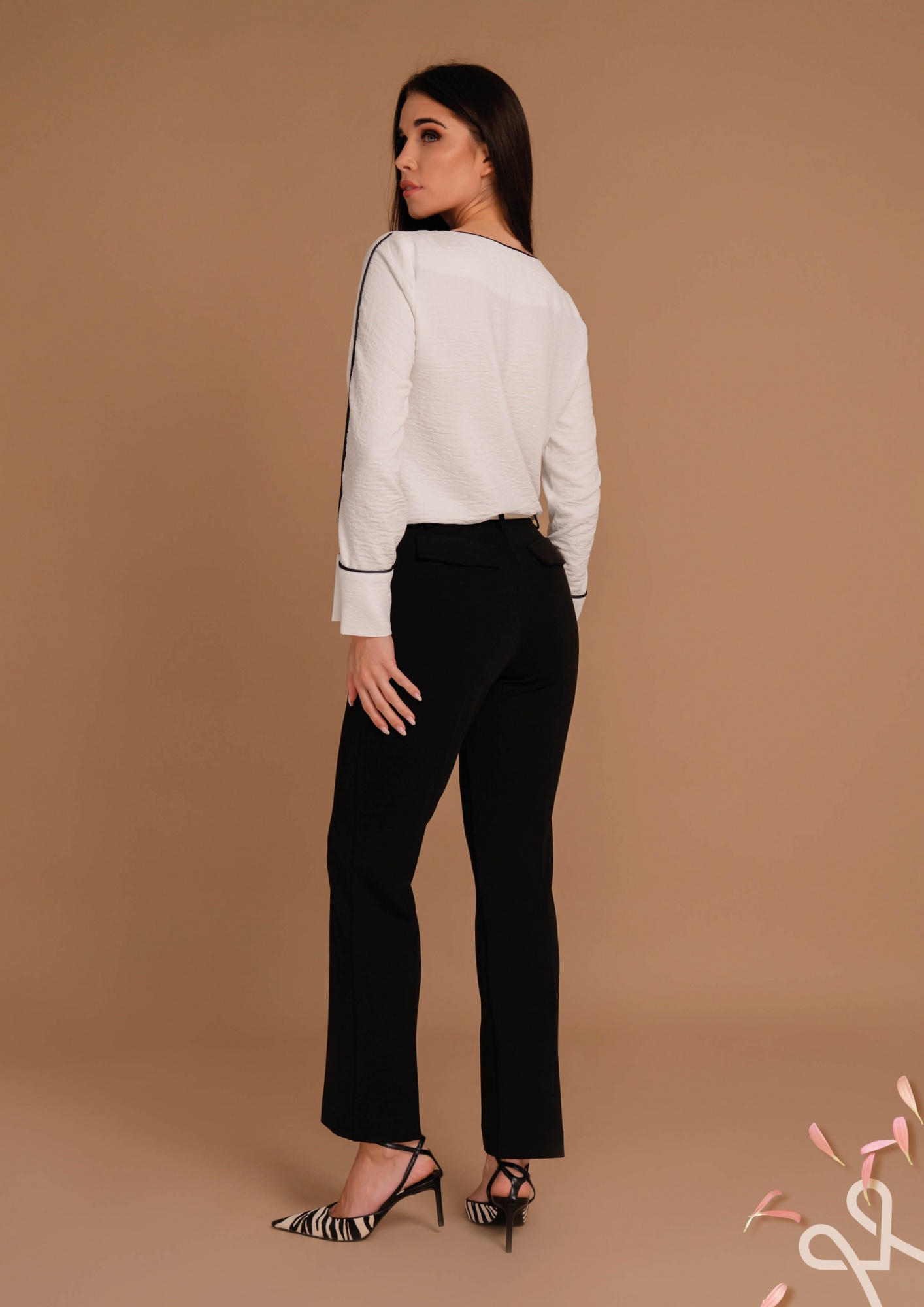 Bővebb fazonú, kevert szálas vajszínű felső elegáns csónaknyakkal, fekete szegéllyel, gombolható széles mandzsettával és paszpólóval díszített részletekkel.