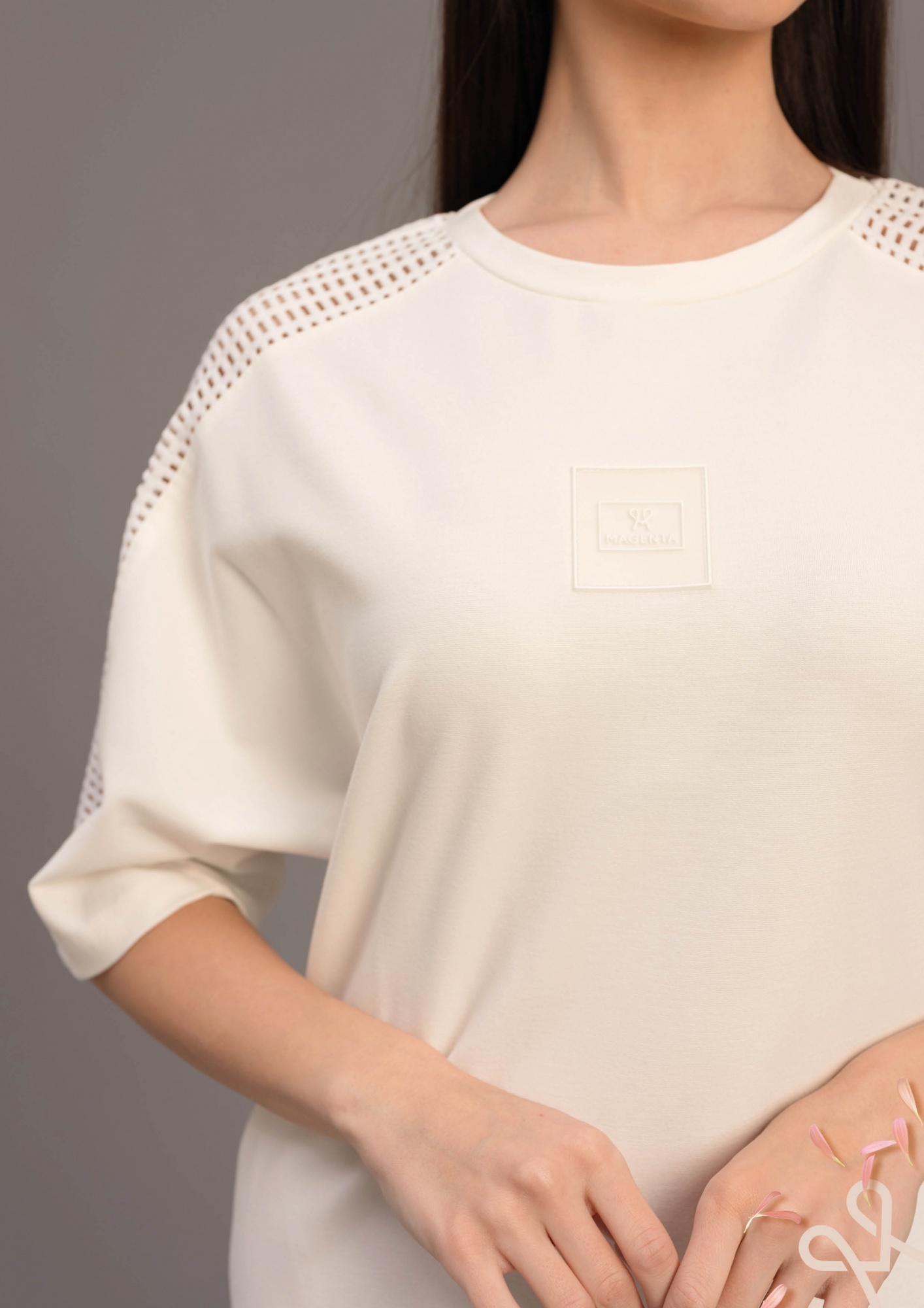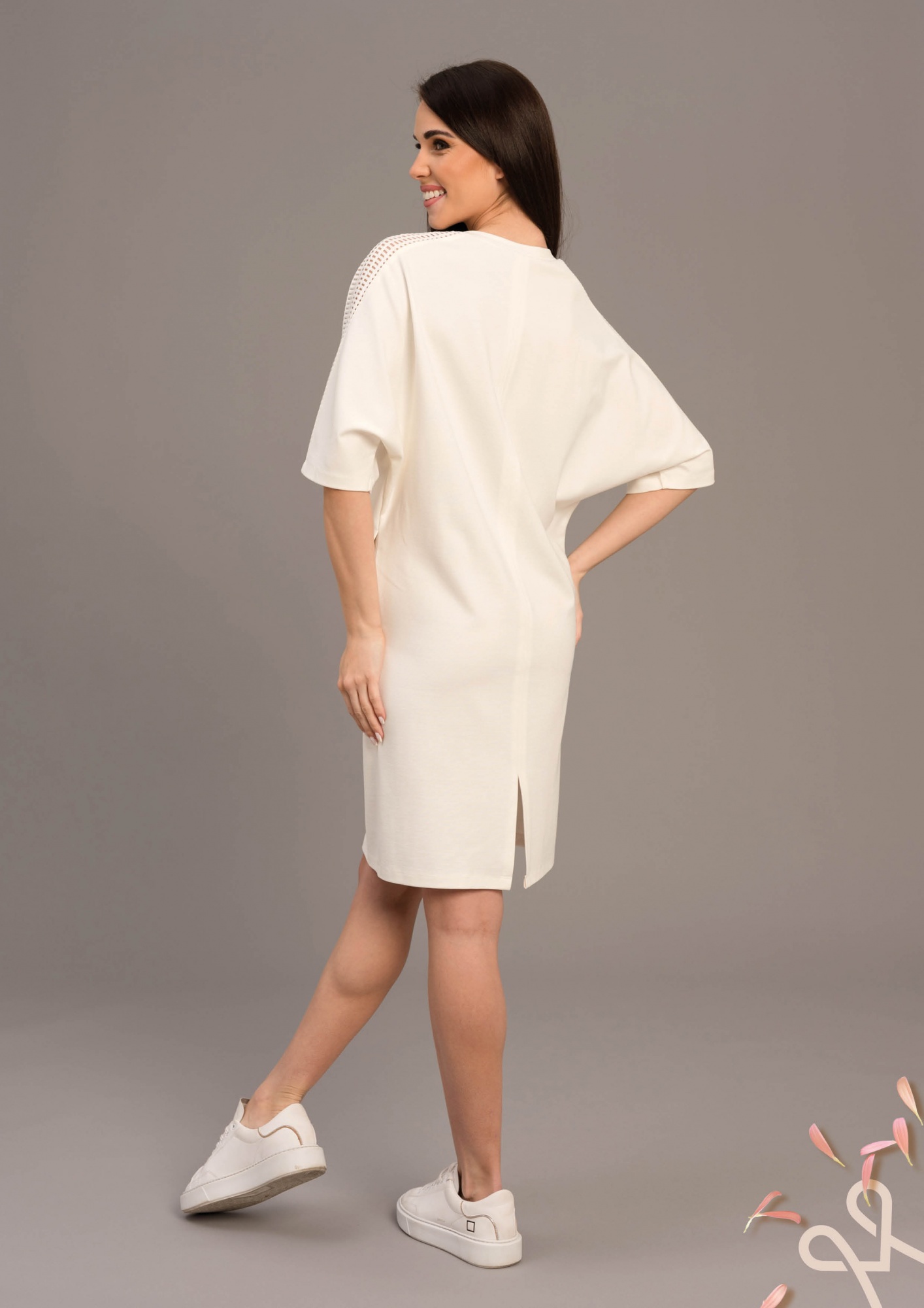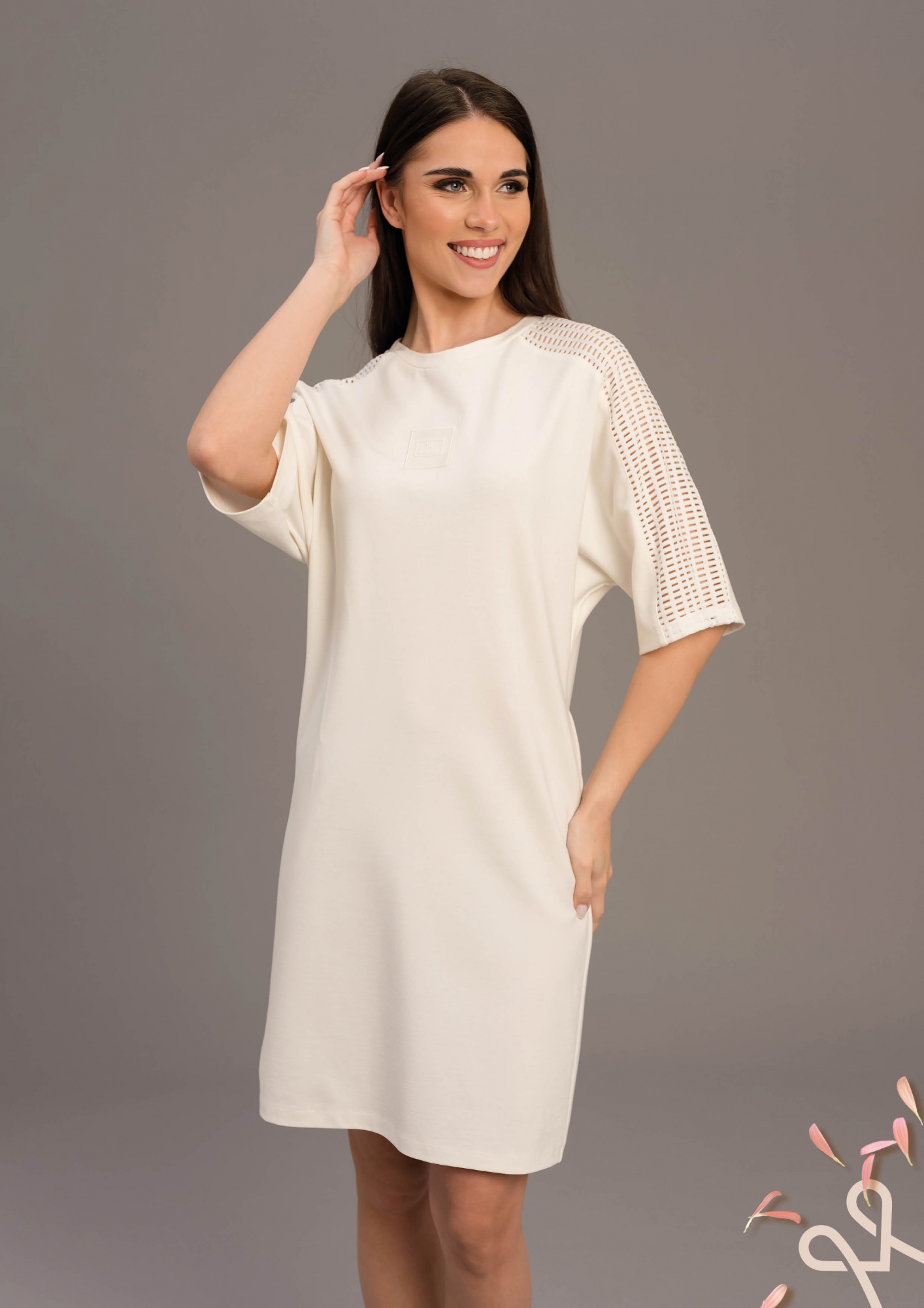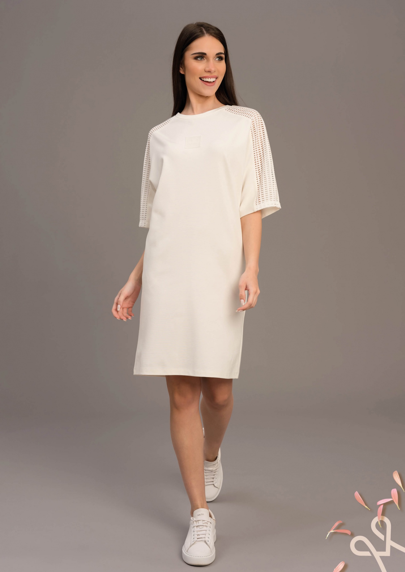 Térdig érő, elasztikus női ruha raglán ujjú szabással, kerek nyakkivágással, 3/4 ujjal, beépített hálós anyag díszítéssel és elején márkajelzéssel.