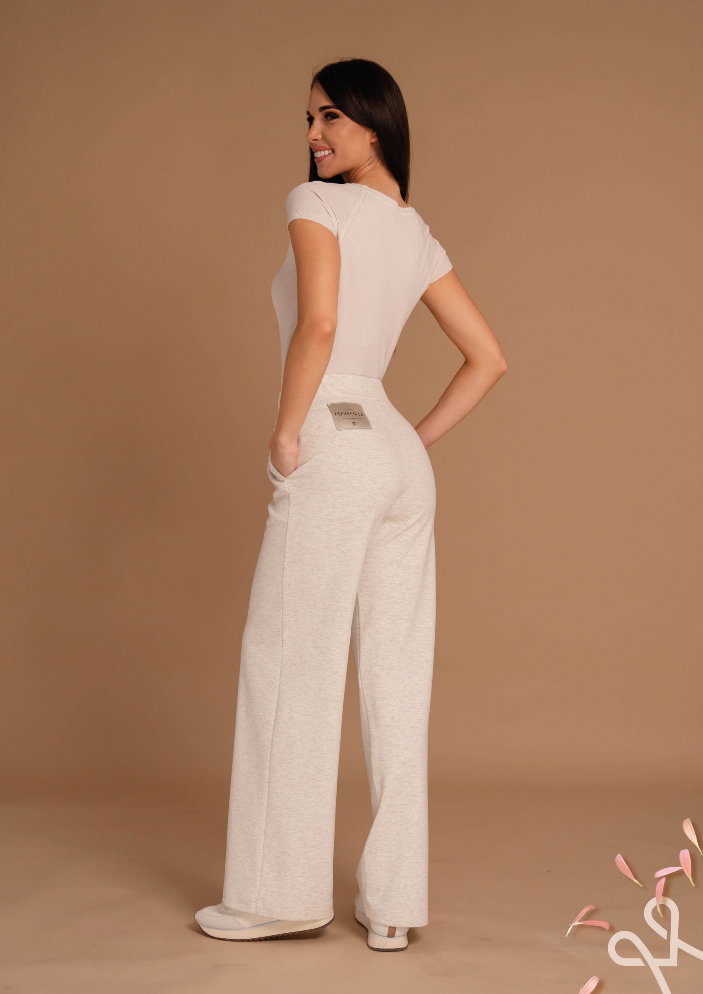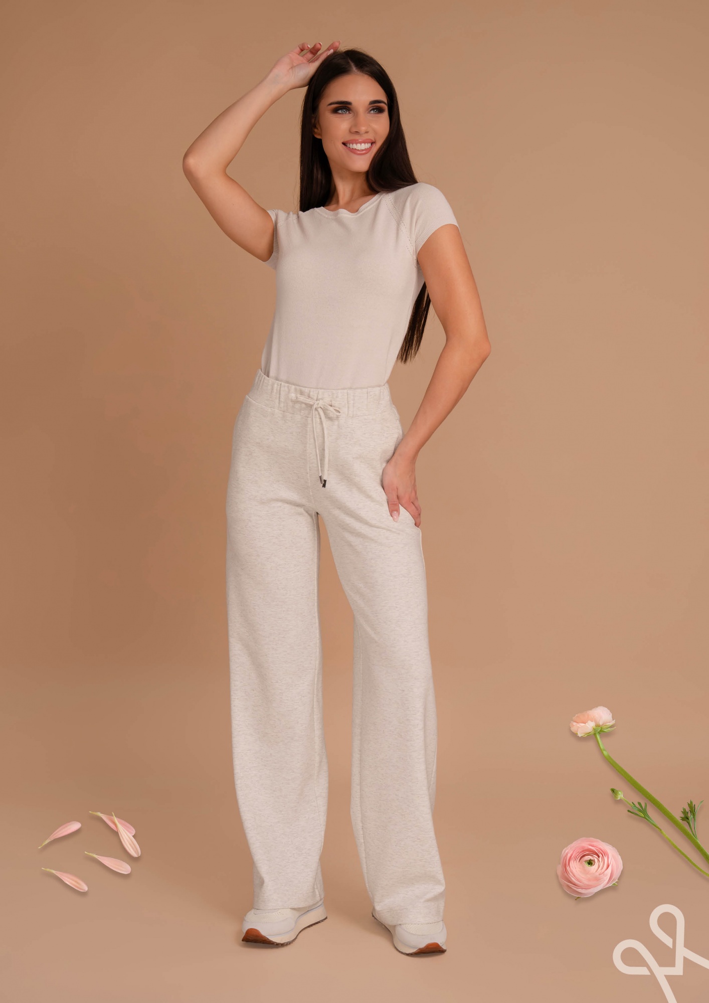 Vajszínű, bővebb szárú, elasztikus pamut melegítő nadrág gumis derékkal, megkötővel és oldalzsebekkel a maximális kényelemért és sportos stílusért.